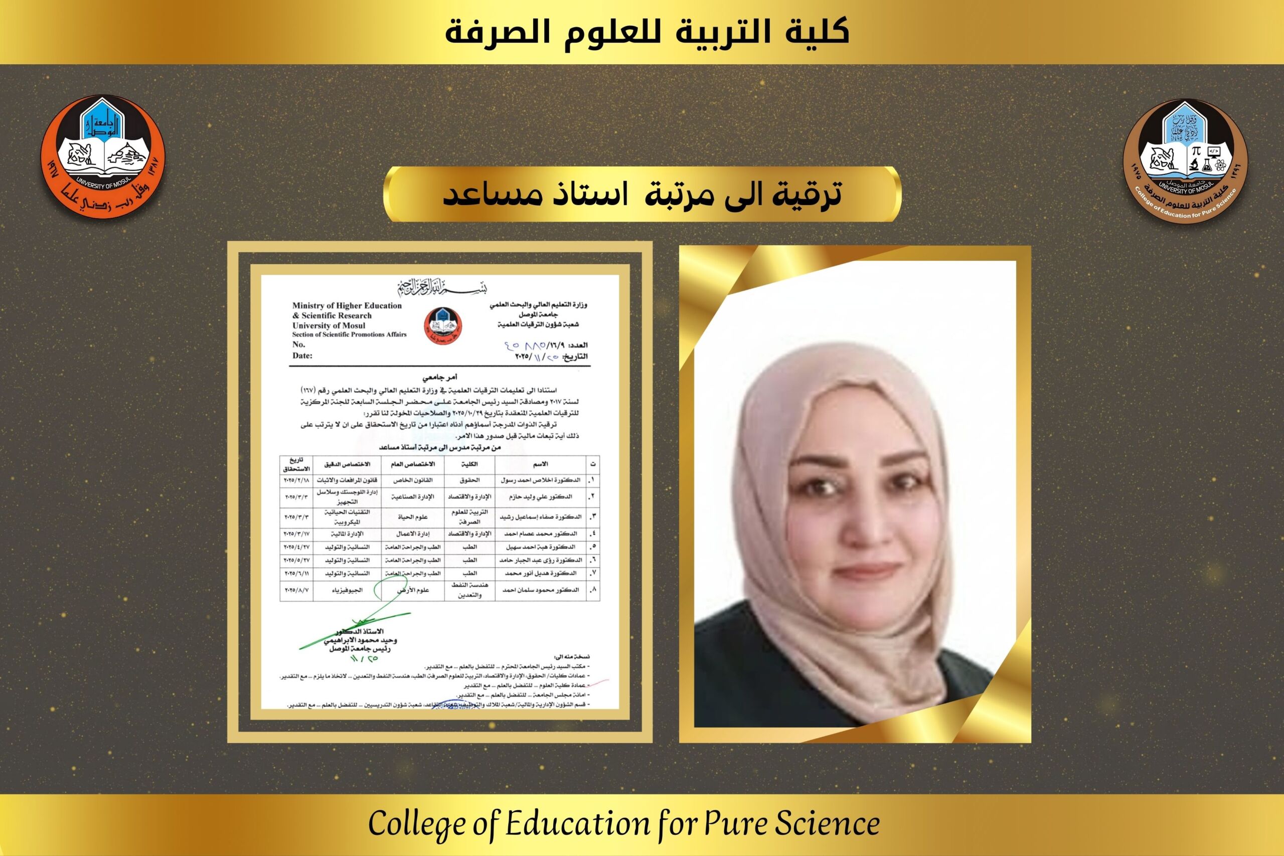 تتقدم أسرة كلية التربية للعلوم الصرفة متمثلة بعميدها الاستاذ الدكتور جاسم فتحي علي المحترم بخالص التهاني والتبريكات الى الدكتورة صفاء اسماعيل رشيد من قسم علوم [إقرأ المزيد]