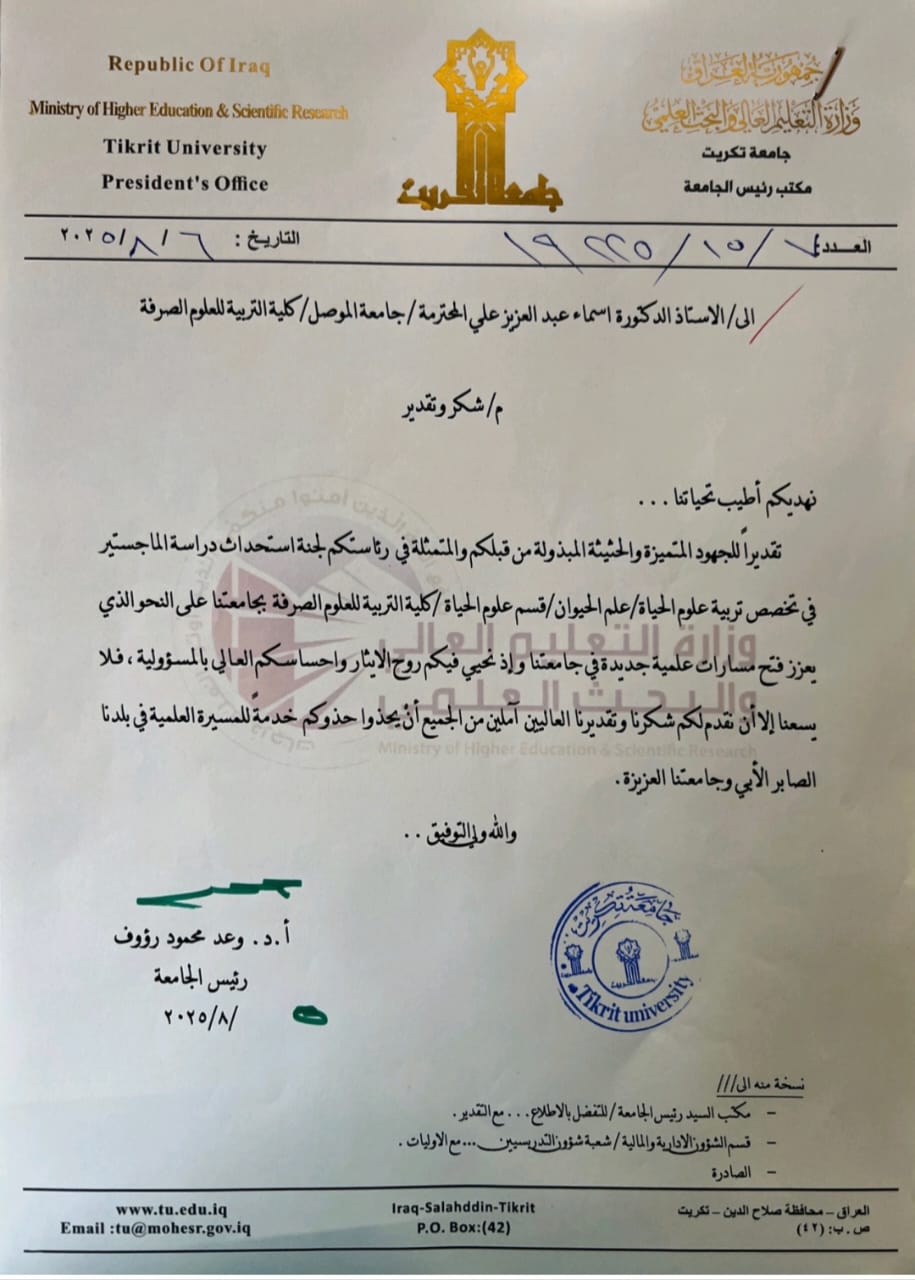 شاركت الاستاذ الدكتورة اسماء عبدالعزيز علي التدريسية في كلية التربية للعلوم الصرفة/ قسم علوم الحياة رئيسا في لجنة وزارية لاستحداث دراسة الماجستير في تخصص تربية علوم الحياة / علم الحيوان في كلية التربية للعلوم الصرفة/ جامعة تكريت وذلك يوم الاربعاء الموافق ٦ آب ٢٠٢٥ واطلعت اللجنة خلال زيارتها على البنى التحتية والامكانات المتوفرة في القاعات الدراسية والمختبرات العلمية بالإضافة إلى الكوادر التدريسية المؤهلة فضلا عن الخطة الدراسية المقترحة.