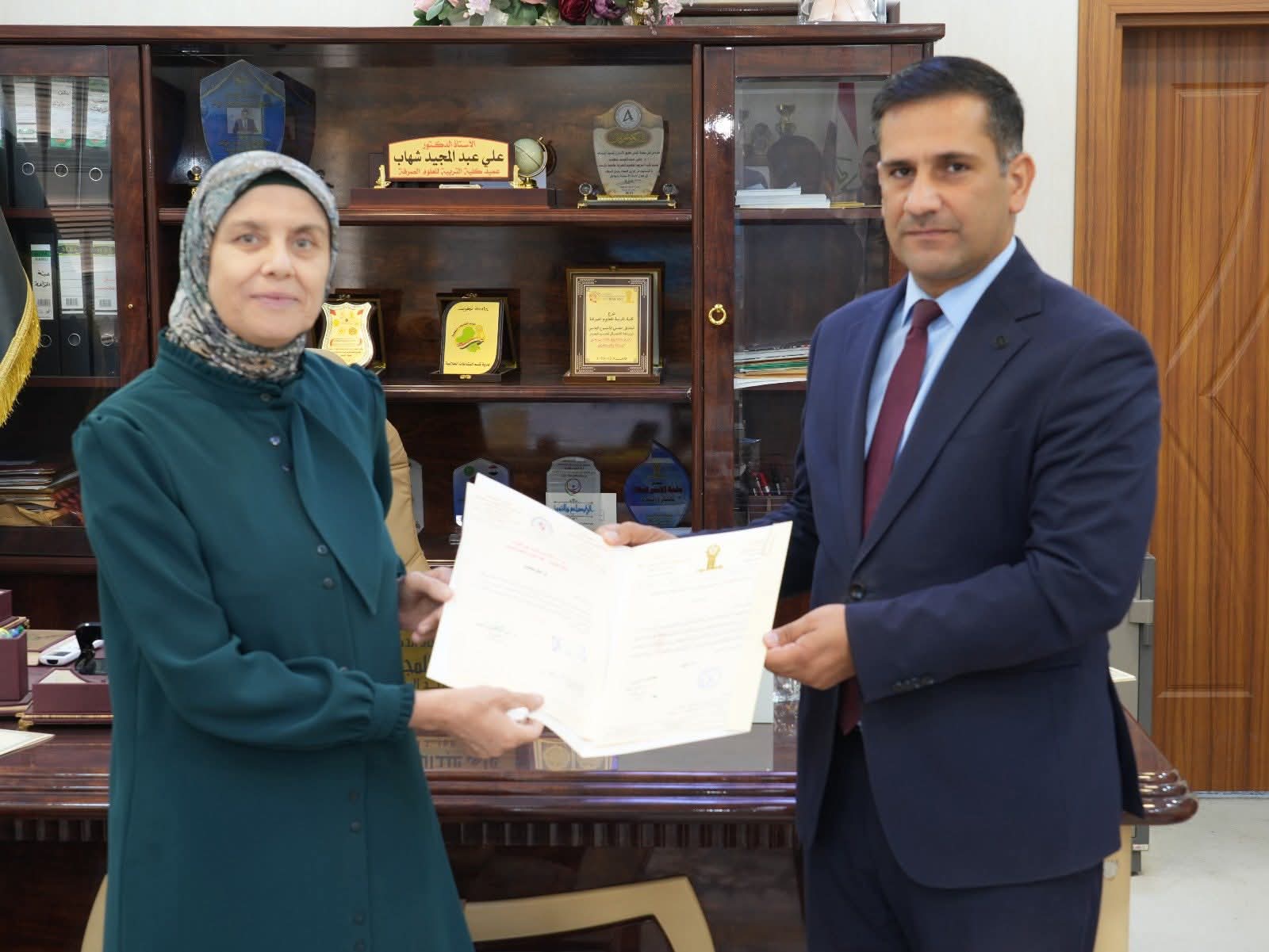 وفي نهاية الجولة قدم السيد عميد الكلية الاستاذ الدكتور علي عبدالمجيد شهاب كتاب شكر وتقدير الى الاستاذ الدكتورة اسماء عبدالعزيز علي.