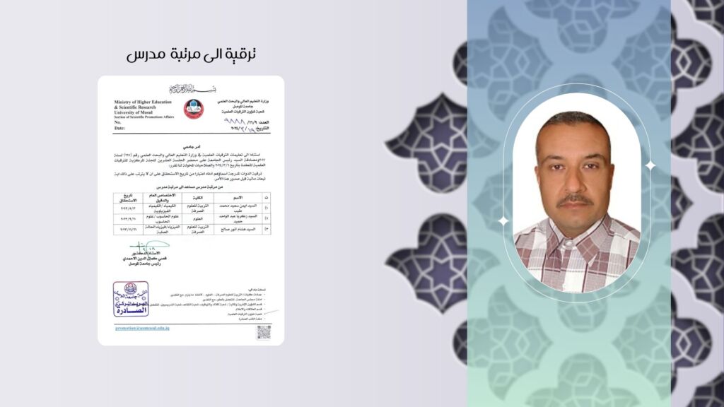تتقدم عمادة كلية التربية للعلوم الصرفة متمثلة بعميدها الاستاذ الدكتور قيس اسماعيل ابراهيم المحترم بخالص التهاني والتبريكات الى الدكتورة صفاء محمد محمود التدريسية في قسم علوم الحياة بمناسبة ترقيتها من مرتبة مدرس الى مرتبة استاذ مساعد بتخصص علوم حياة/اللافقريات حسب الأمر الجامعي المرقم ٩/ ١٦ /٩٨٨٧ بتاريخ ١٩/ ٣ / ٢٠٢٤