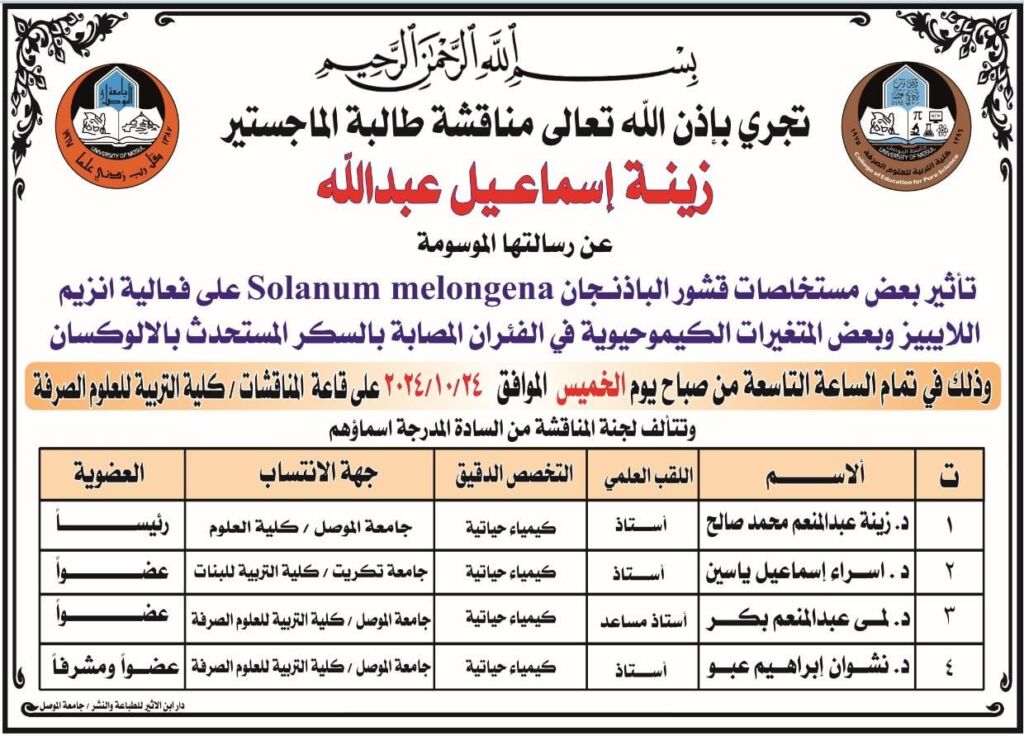 تتقدم عمادة كلية التربية للعلوم الصرفة متمثلة بعميدها الاستاذ الدكتور قيس اسماعيل ابراهيم المحترم بخالص التهاني والتبريكات الى الدكتورة رغد محمد عبدالله بمناسبة ترقيتها من مرتبة مدرس الى مرتبة استاذ مساعد بتخصص علوم الحياة/ التقنيات الحياتية النباتية حسب الأمر الجامعي المرقم ٩/١٦/٣٥٧٤٠ بتاريخ ١٧/١٠/٢٠٢٤