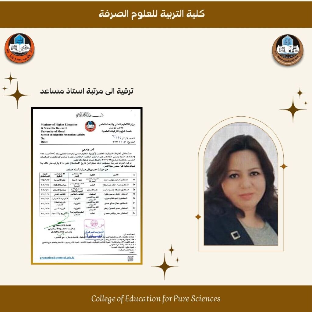 تتقدم عمادة كلية التربية للعلوم الصرفة متمثلة بعميدها الاستاذ الدكتور قيس اسماعيل ابراهيم المحترم بخالص التهاني والتبريكات الى الدكتور عمار تحسين زكر بمناسبة ترقيته من مرتبة مدرس الى مرتبة استاذ مساعد بتخصص الفيزياء / فيزياء الليزر حسب الأمر الجامعي المرقم ٩/١٦/٦٦١٢ بتاريخ ١٣/٢/٢٠٢٥
