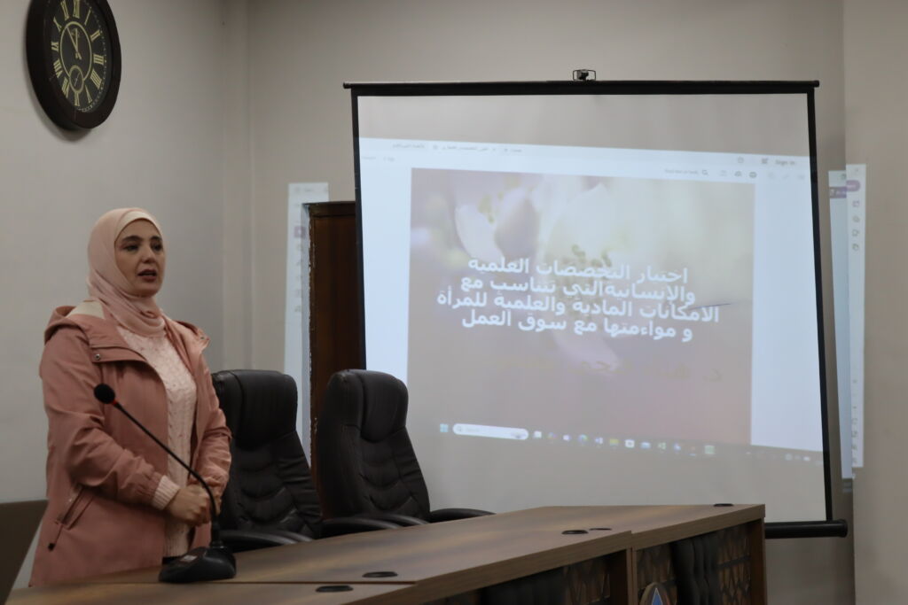 ورشة عمل بعنوان ضرورة الاهتمام باختيار التخصصات العلمية والانسانية التي تتناسب مع الامكانات المادية والعلمية للمرأة ومواءمتها مع متطلبات سوق العمل