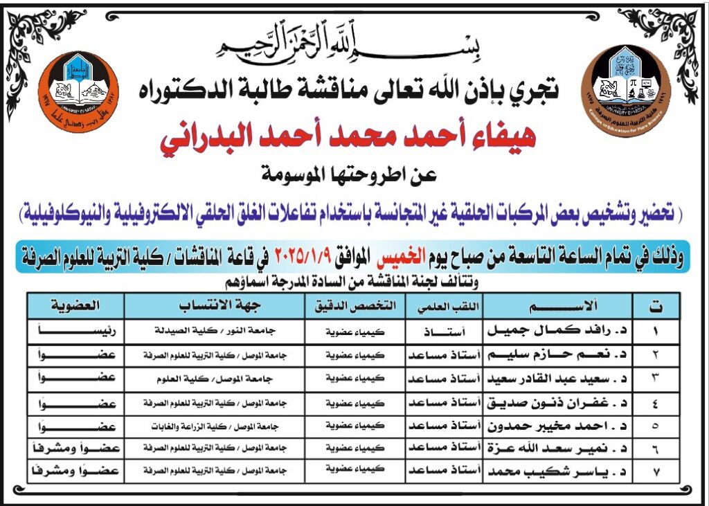 إعلان مناقشة اطروحة دكتوراه - قسم الكيمياء