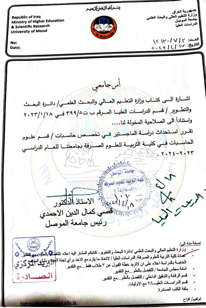 استحداث دراسة الماجستير في قسم علوم الحاسوب للعام الدراسي ٢٠٢٣_٢٠٢٤