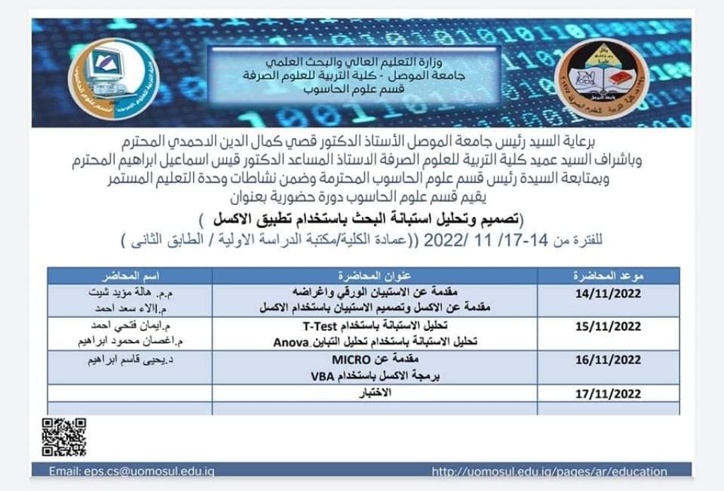 برعاية السيد رئيس جامعة الموصل الأستاذ الدكتور قصي كمال الدين الاحمدي المحترموبإشراف السيد عميد كلية التربية للعلوم الصرفة الأستاذ المساعد الدكتور قيس اسماعيل ابراهيم المحترموبمتابعة السيدة رئيسة قسم علوم الحاسوب المحترمةوضمن نشاطات وحدة التعليم المستمر اقام قسم علوم الحاسوب دورة حضورية بعنوان”تصميم وتحليل استبانة البحث باستخدام تطبيق الاكسل”للفترة من 14 إلى 17 تشرين الثاني 2022 في مكتبة الدراسات الأولية في عمادة الكليةحيث اختتمت الدورة اليوم الخميس باجراء اختبار للمشاركين في الدورة.شعبة الإعلام والعلاقات العامةكلية التربية للعلوم الصرفةالخميس المصادف 17 تشرين الثاني 2022.