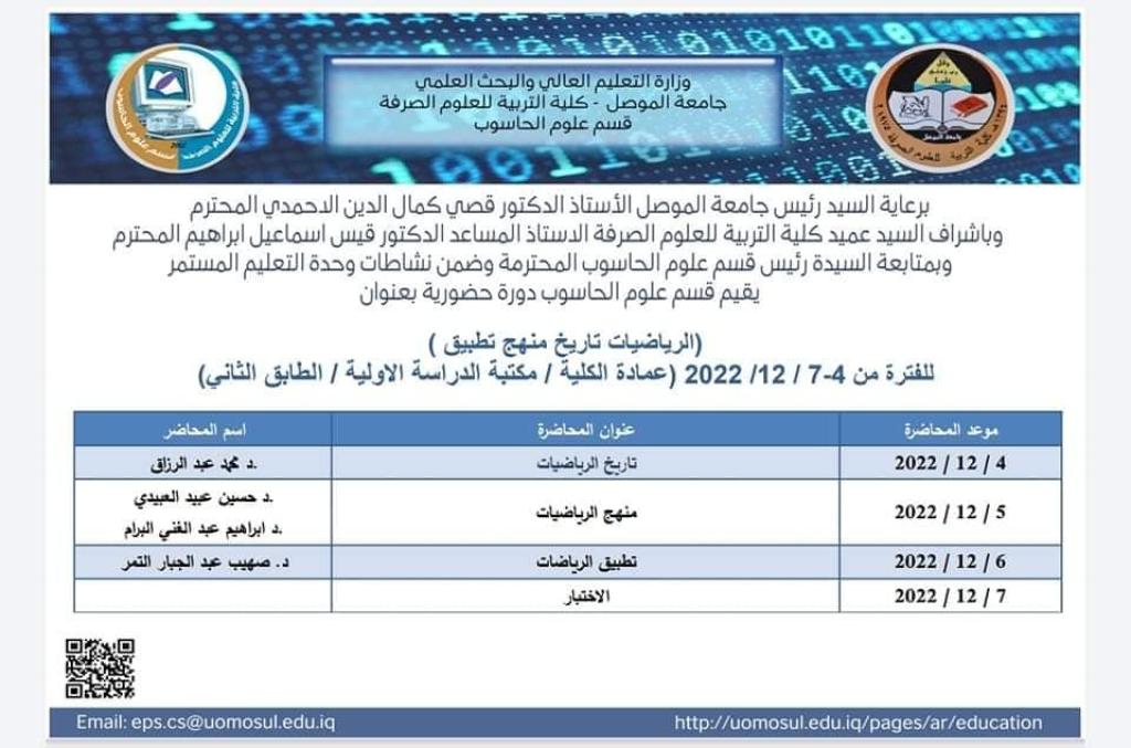 برعاية السيد رئيس جامعة الموصل الأستاذ الدكتور قصي كمال الدين الأحمدي المحترموبإشراف مباشر من السيد عميد كلية التربية للعلوم الصرفة الأستاذ المساعد الدكتور قيس اسماعيل ابراهيم المحترموبتنسيق السيدة رئيسة قسم علوم الحاسوب المحترمةوضمن نشاطات وحدة التعليم المستمر في الكليةاقام قسم علوم الحاسوب دورة تدريبية بعنوان” الرياضيات تاريخ منهج تطبيق”ولمدة أربعة ايام للفترة من 4 الى 7 كانون الأول 2022تم اختتام الدورة اليوم الخميس الثامن من شهر كانون الاول ٢٠٢٢ بإجراء الامتحان الالكتروني للمشتركين فيها.شعبة الإعلام والعلاقات العامةكلية التربية للعلوم الصرفةالخميس المصادف ٨ كانون الأول ٢٠٢٢.