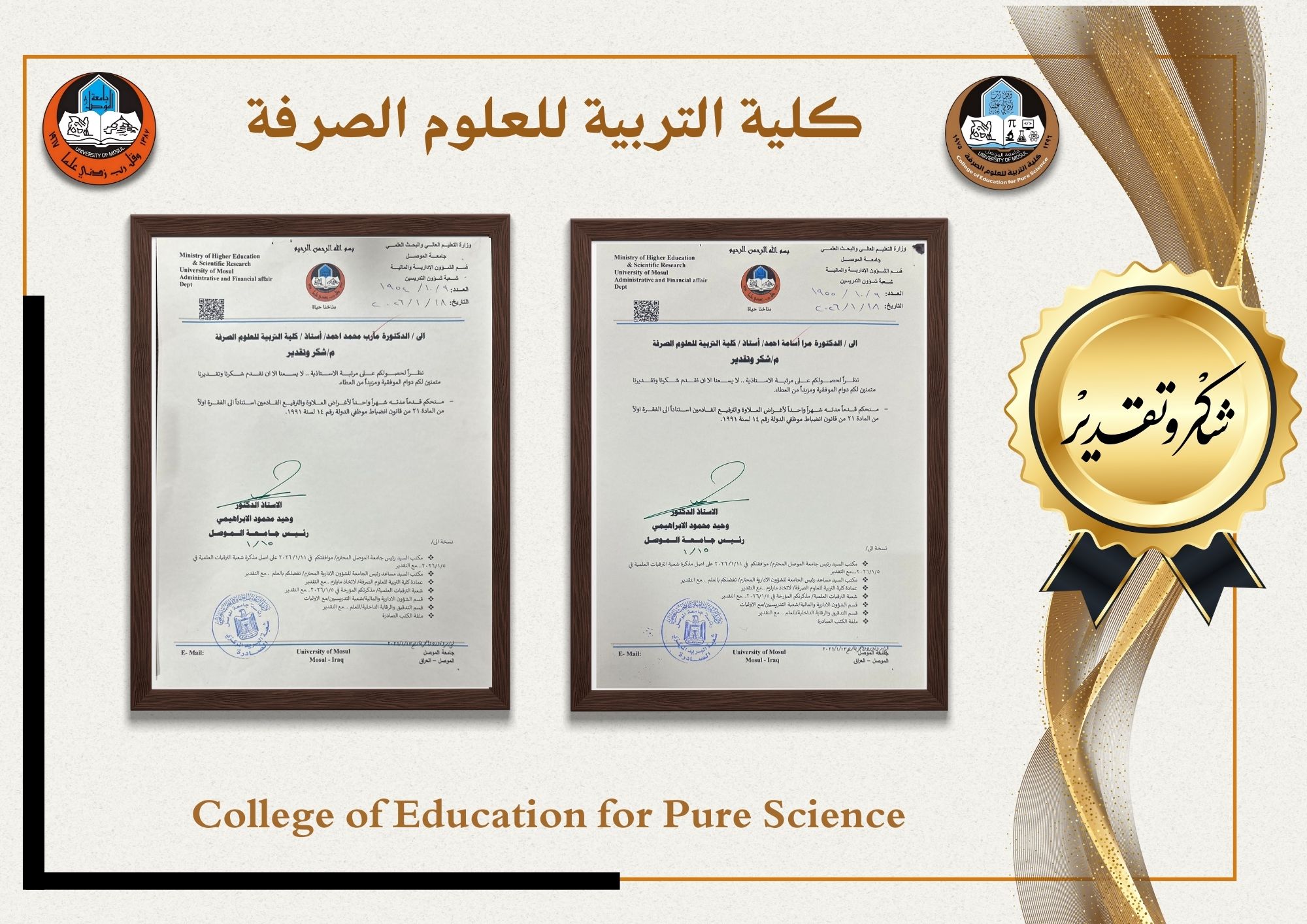 حضر جانبا منها السيد معاون العميد للشؤون الإدارية الاستاذ المساعد الدكتور يونس سعدي سعيد المحترم والسيد رئيس قسم الكيمياء الاستاذ المساعد الدكتور عمر ذنون علي المحترم.