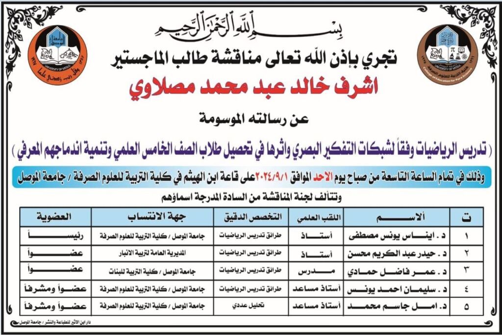 ترأس لجنة المناقشة الاستاذ مساعد الدكتور ياسر حسين محمد وعضوية كل من الاستاذ مساعد الدكتور ذو الفقار علي زكر والاستاذ مساعد الدكتور محمد محمود يونس وباشراف وعضوية الاستاذ مساعد الدكتور غزوان غازي علي والاستاذ مساعد الدكتور مروان حفيظ يونس.