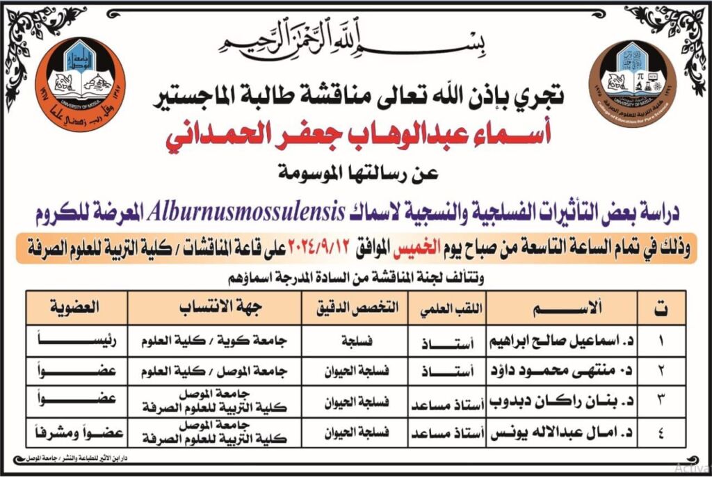 ترأس لجنة المناقشة الاستاذ الدكتور قيس إسماعيل ابراهيم وعضوية كل من الاستاذ مساعد الدكتور ايفان صبحي لطيف والاستاذ مساعد الدكتورة منى محسن محمد علي وباشراف وعضوية الاستاذ مساعد الدكتورة مهى صلاح يونس.