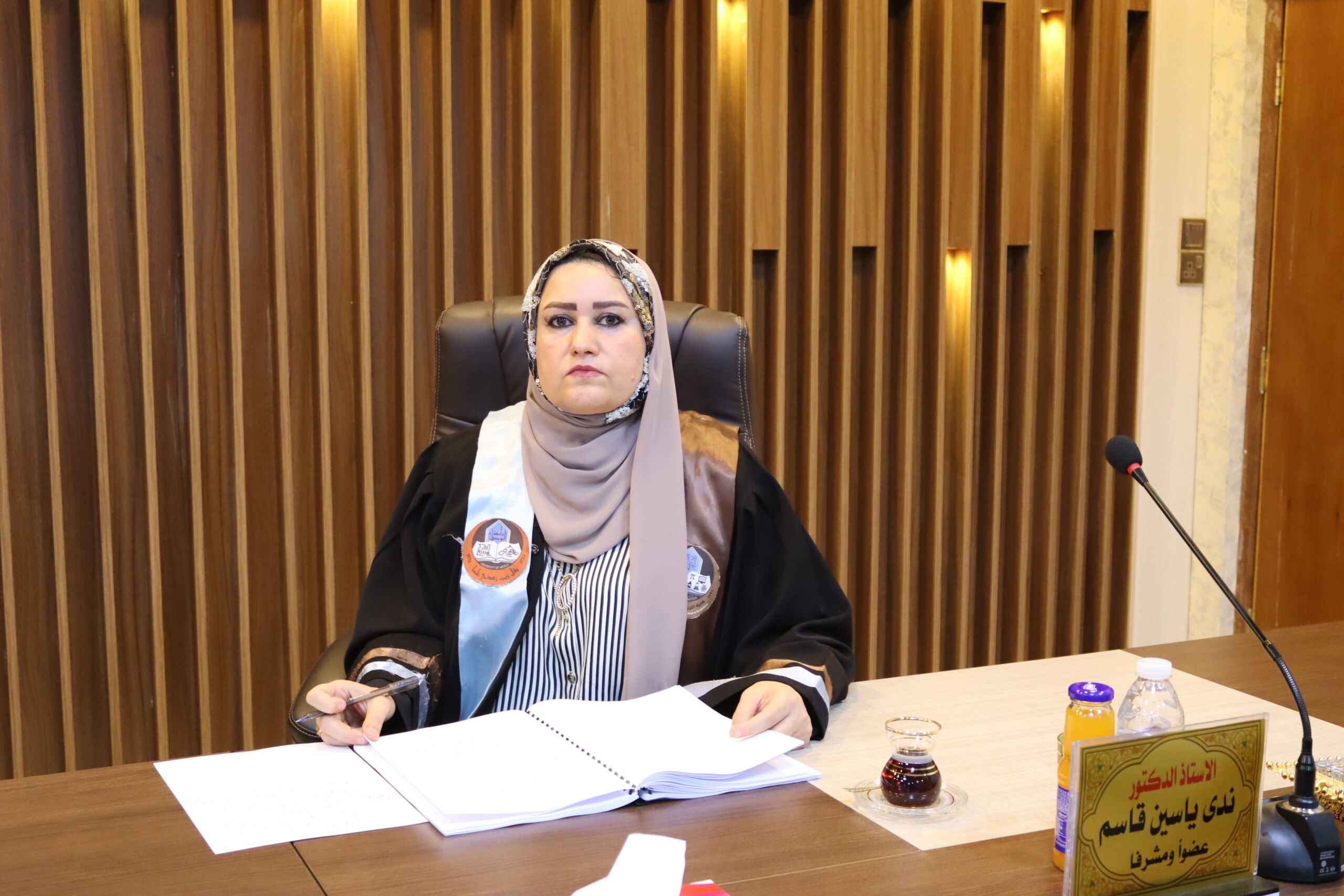 ترأس لجنة المناقشة الأستاذ الدكتورة رائدة داؤد محمود وعضوية كل من الأستاذ الدكتور نجم عبد الزهرة مخرب والأستاذ المساعد الدكتور صبيح وديع إسكندر وبإشراف وعضوية الأستاذ الدكتورة ندى ياسين قاسم.
