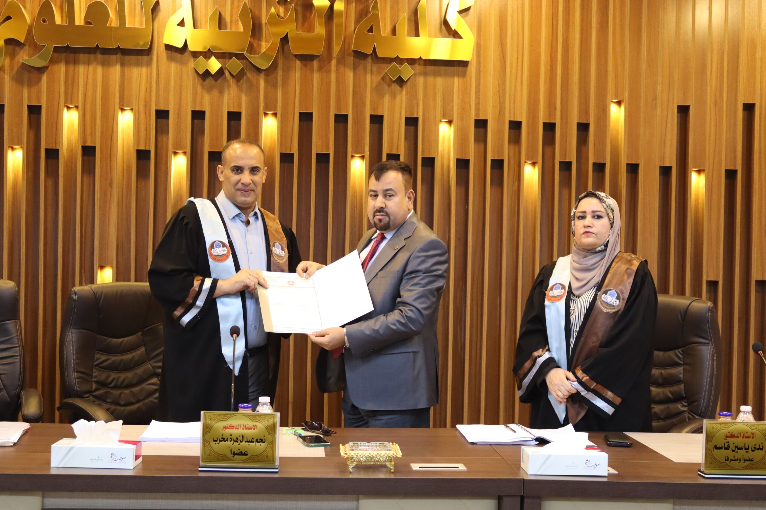 وقدم السيد عميد الكلية كتاب شكر وتقدير الى الأستاذ الدكتور نجم عبد الزهرة مخرب من كلية العلوم/ الجامعة المستنصرية لتحمله مشقة السفر والمشاركة في مناقشة الطالب.