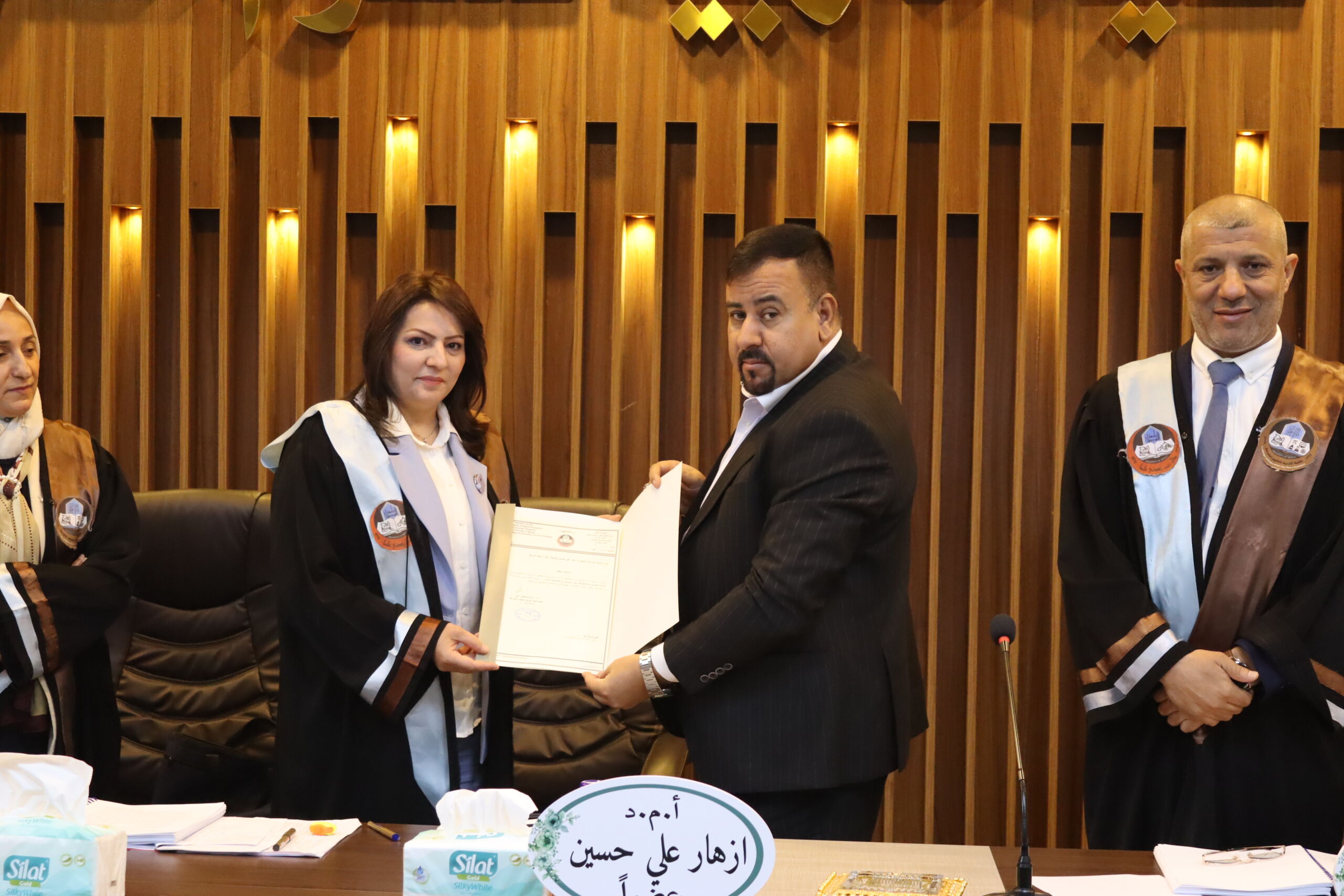 وقدم السيد عميد الكلية كتاب شكر وتقدير الى الأستاذ المساعد الدكتورة ازهار علي حسين من كلية التربية/ جامعة زاخو لمشاركتها في مناقشة الطالبة.