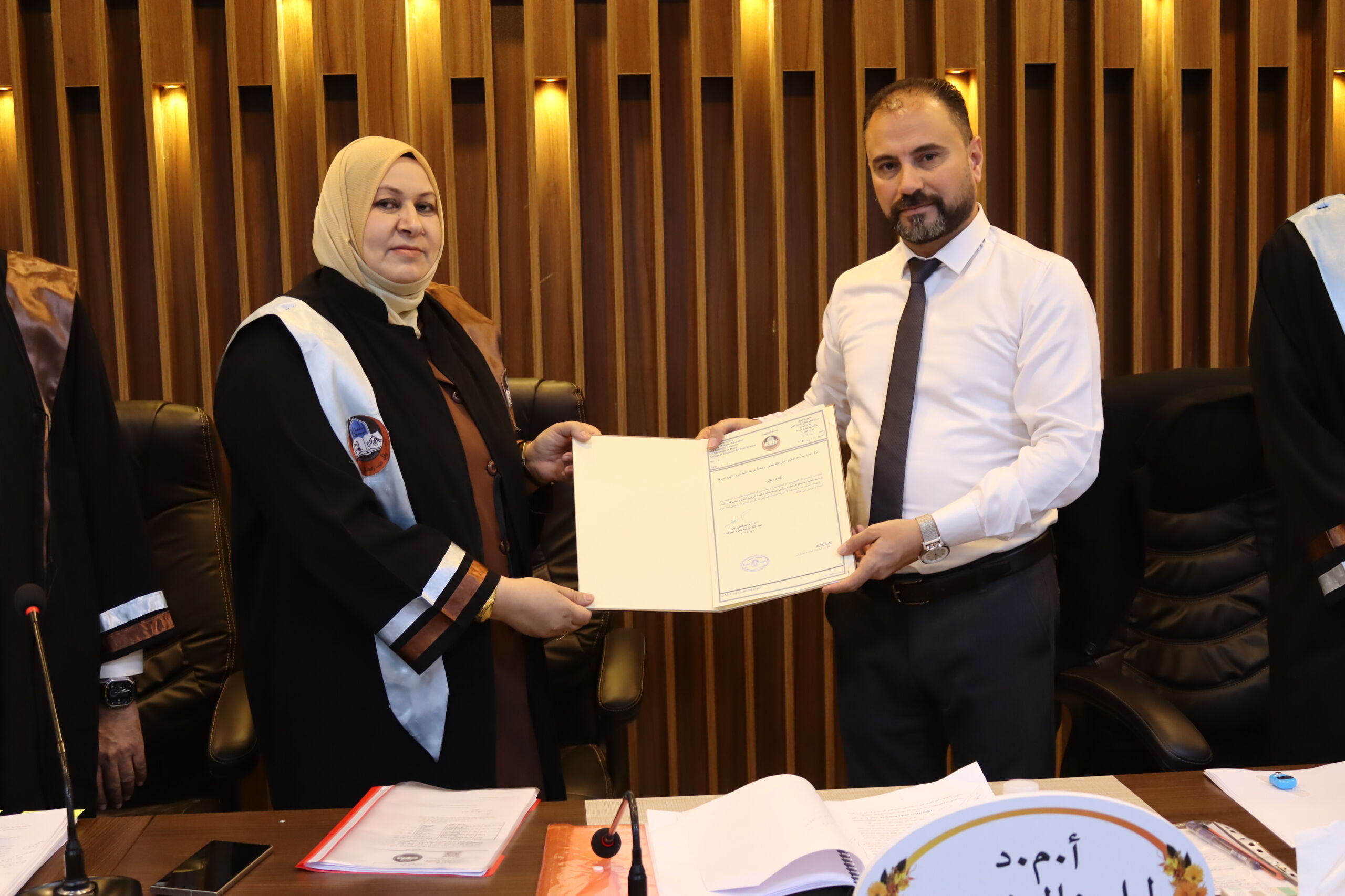 وقدم السيد معاون العميد للشؤون العلمية كتاب شكر وتقدير الى الأستاذ المساعد الدكتورة ليلى خالد خضير من كلية التربية للعلوم الصرفة / جامعة تكريت لتحملها عناء السفر والمشاركة في مناقشة الطالبة.
