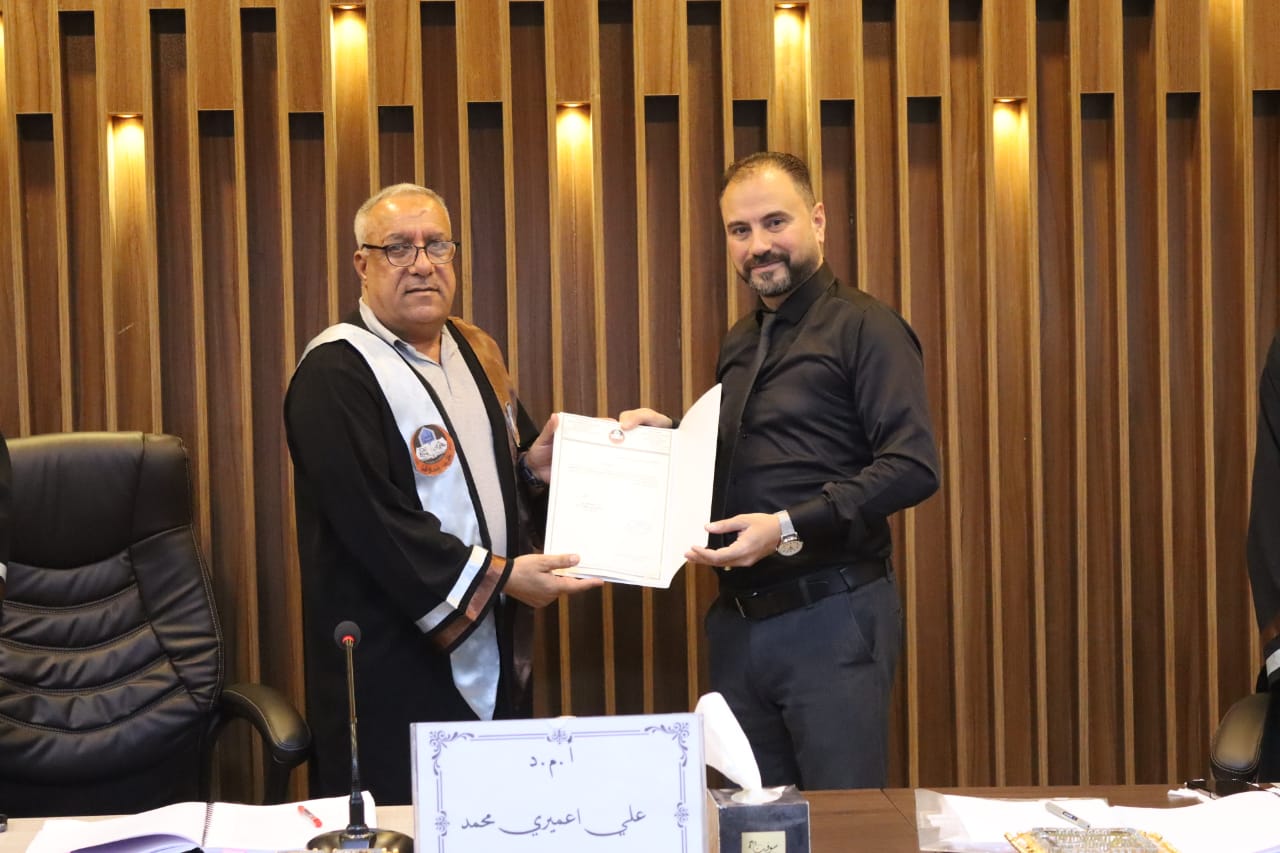وقدم السيد معاون العميد للشؤون العلمية المحترم كتاب شكر وتقدير الى الأستاذ المساعد الدكتور علي اعميري محمد من كلية العلوم / جامعة تكريت وذلك لتحمله عناء السفر ومشاركته في مناقشة الطالب.