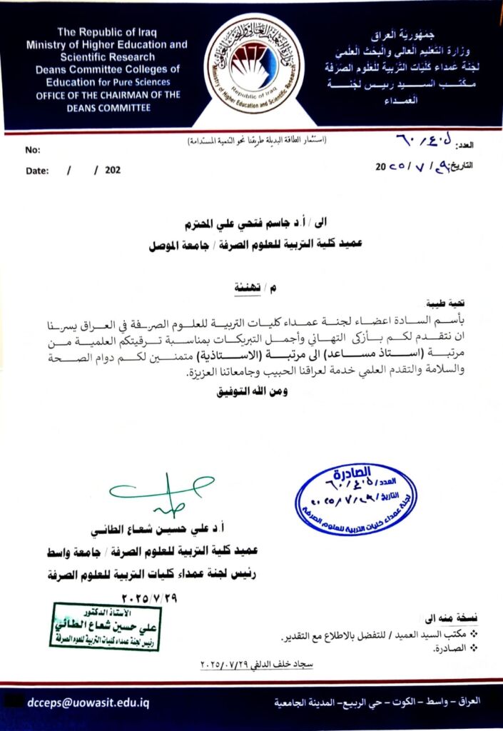 تهنئة ومباركة للسيد عميد كلية التربية للعلوم الصرفة المحترم بمناسبة ترقيته العلمية ...