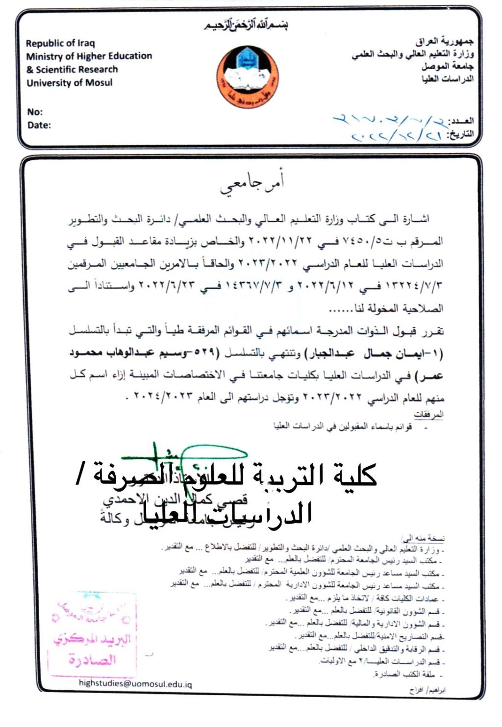 اعلان من شعبة الدراسات العليا في كلية التربية للعلوم الصرفةصدور الأمر الجامعي بالتوسعةصدر مؤخرا الأمر الجامعي باسماء المقبولين حسب التوسعة الأخيرة التي صدرت من وزارة التعليم العالي والبحث العلمي. فعلى جميع الاخوة والاخوات اللذين ظهرت اسماءهم ادناه مراجعة شعبة الدراسات العليا في كلية التربية للعلوم الصرفة لغرض اكمال اجراءات القبول.ألف ألف مبروك لجميع المقبولينشعبة الإعلام والعلاقات العامةكلية التربية للعلوم الصرفةالاحد المصادف 25 كانون الأول 2022