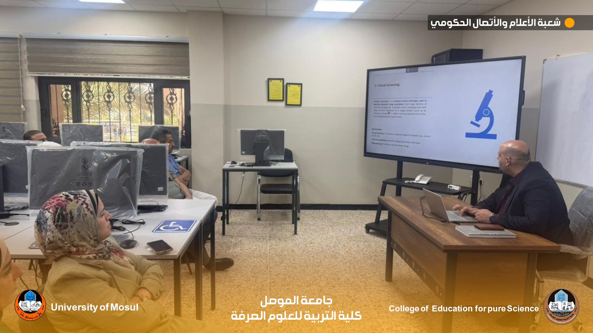 برعاية السيد رئيس جامعة الموصل الأستاذ الدكتور وحيد محمود الإبراهيمي المحترم،وبإشراف السيد عميد كلية التربية للعلوم الصرفة الأستاذ الدكتور جاسم فتحي علي المحترم،أقام قسم علوم الحاسوب في كلية التربية للعلوم الصرفة ورشة عمل بعنوان:‏“Computer-Aided Drug Discovery” وذلك يوم الاربعاء الموافق ١٥ تشرين الاول ٢٠٢٥ المحاضرةألقاها المدرس الدكتور محمد خلدون محمود وبحضور عدد من تدريسيي القسم، تناولت الورشة استخدام التقنيات الحاسوبية في مجال اكتشاف الأدوية، وهو مجال متعدد التخصصات يشهد تطورًا مستمرًا في أساليبه وأدواته لما لهذه التقنيات من دور محوري في مراحل اكتشاف وتطوير الأدوية الجديدة.