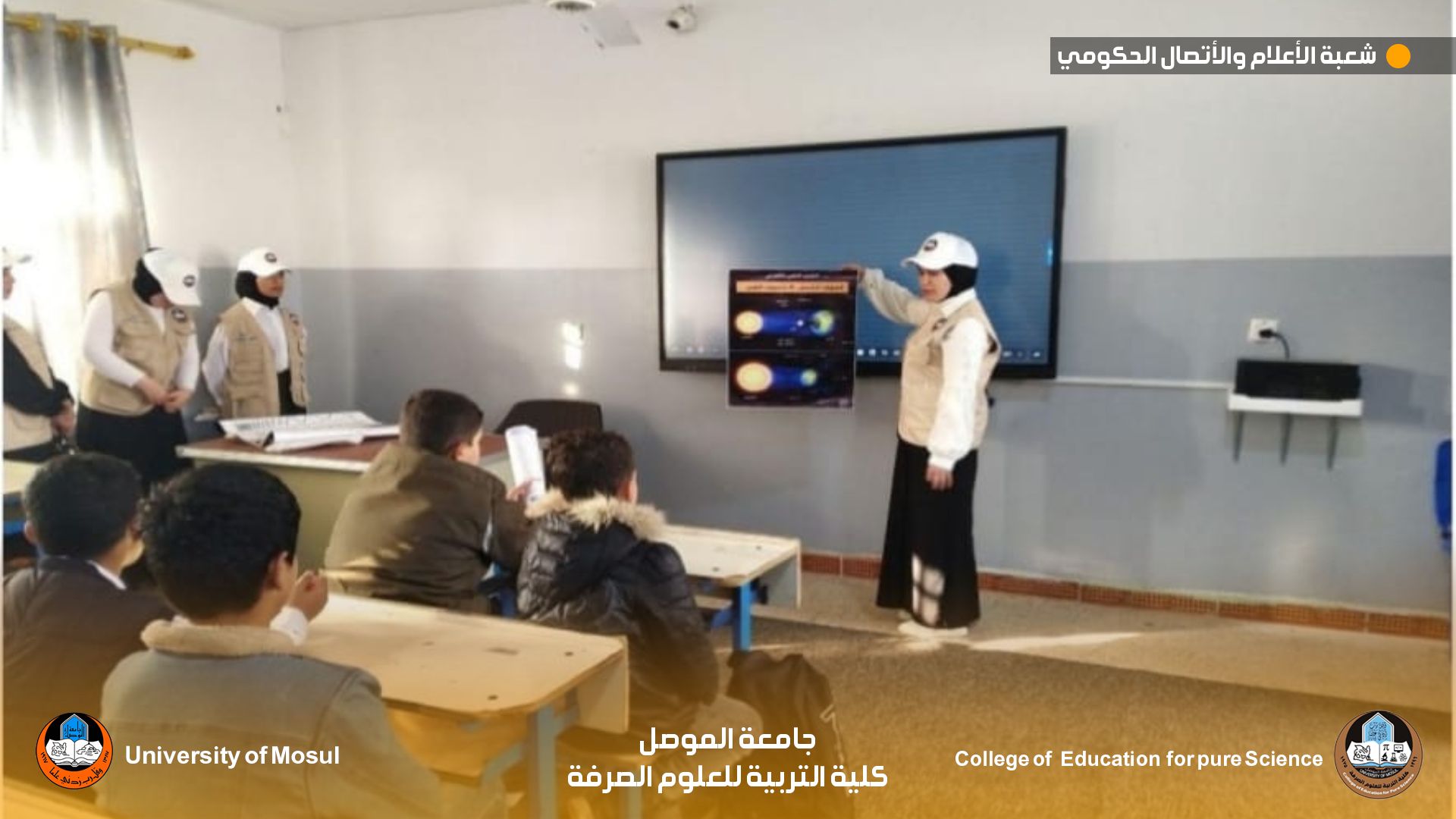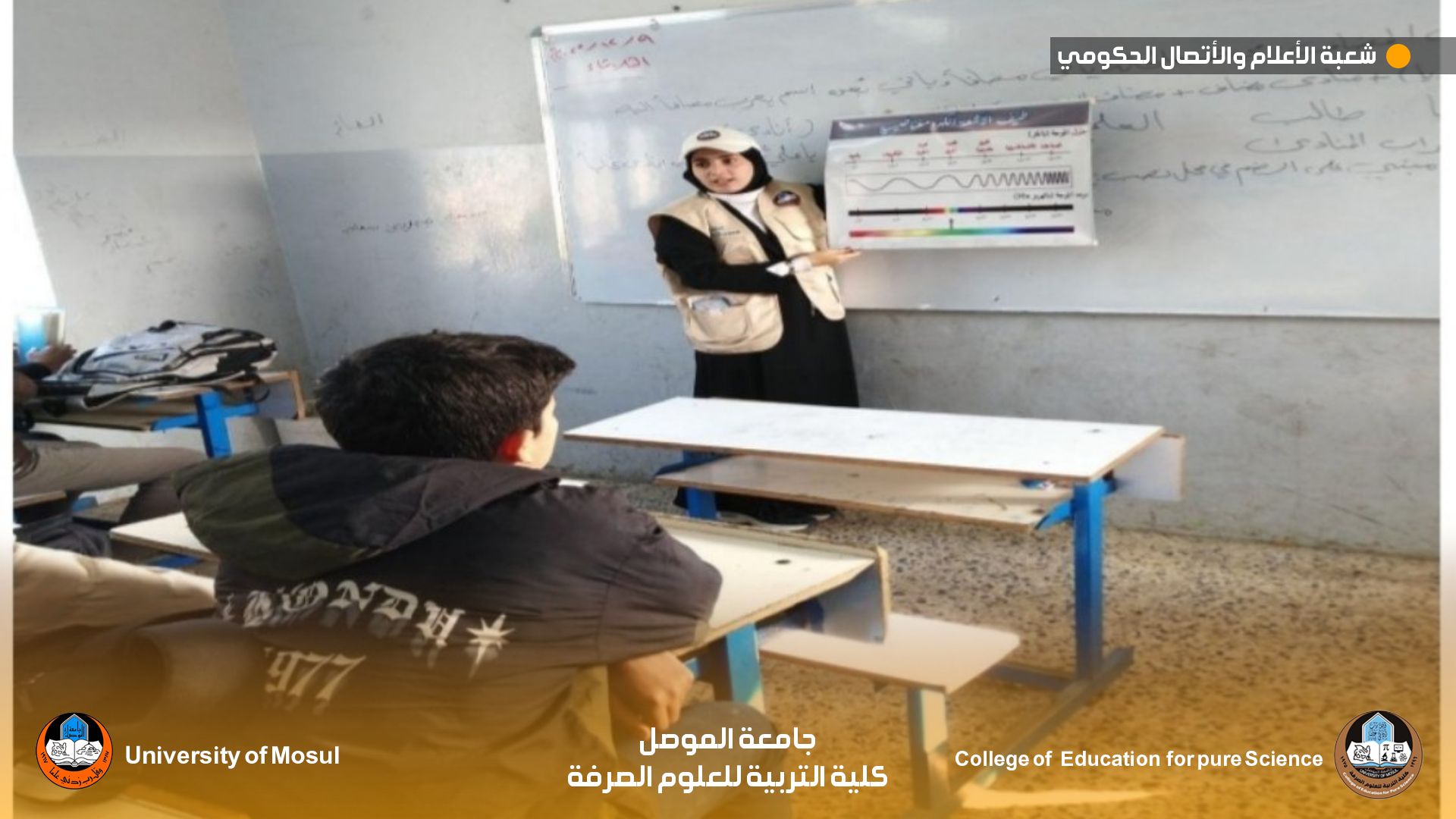نظم فريق تطوعي من طلبة المرحلة الرابعة في قسم الفيزياء وبإشراف المدرس المساعد أسماء زكي خليل، يوم الخميس الموافق ١١ كانون الأول ٢٠٢٥، عملاً تطوعياً شمل تصميم وإهداء مجموعة من البوسترات التعليمية المبتكرة إلى مدرسة متوسطة المروءة للبنين، شملت البوسترات توضيحاً لظواهر فيزيائية مثل المجالات المغناطيسية وطيف الحقل المغناطيسي، وطيف الأشعة الكهرومغناطيسية، وظاهرتي كسوف الشمس وخسوف القمر، بالإضافة إلى أنواع الموجات كالموجة الطولية والمستعرضة.