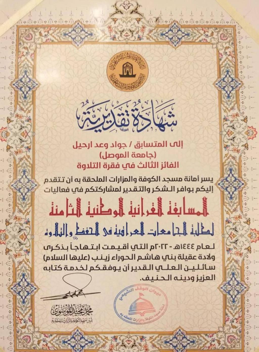 حصل السيد جواد وعد ارحيل الطالب في كلية التربية للعلوم الصرفة/ المرحلة الرابعة / قسم علوم الحاسوب على المركز الثالث في فرع التلاوة المقامة بالفترة من ٢-٣من شهر كانون الاول ٢٠٢٢ في مدينة النجف الاشرف.ألف مبروك للطالب جواد وعد ارحيل. والى المزيد من التميز لطلبة كليتنا.شعبة الإعلام والعلاقات العامةكلية التربية للعلوم الصرفةالسبت المصادف 3 كانون الأول 2022.