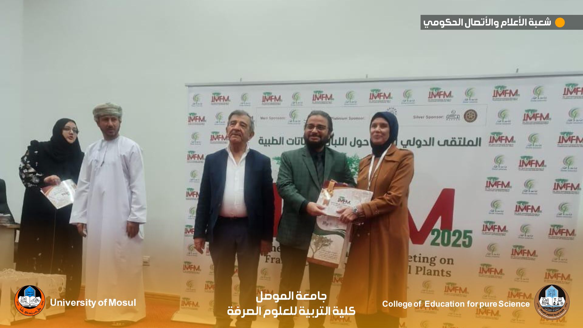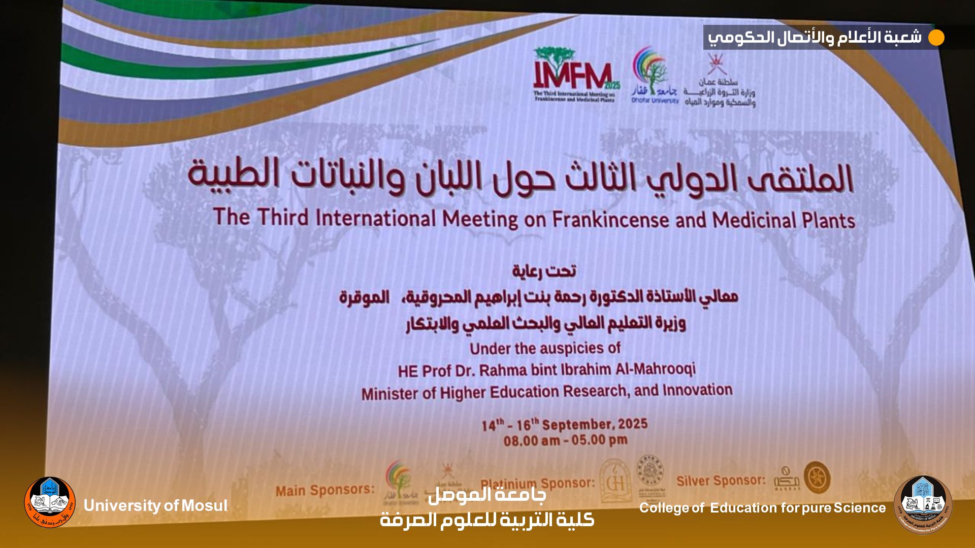 شارك مجموعة من التدريسين في كلية التربية للعلوم الصرفة/ قسم علوم الحياة في الملتقى الدولي الثالث حول اللبان والنباتات الطبية المقام في سلطنة عمان – صلالة / جامعة ظفار للفترة من ١٤-١٦ أيلول ٢٠٢٥ حيث شاركت الاستاذ الدكتورة اسماء عبد العزيز علي ببحثين وبعضوية اللجنة العلمية للمؤتمر وشاركت الاستاذ الدكتورة شفاء مهدي صالح ببحث اما الاستاذ الدكتورة جميلة هزاع رشيد والاستاذ الدكتور قتيبة شعيب النعمة فقد شاركا بحضور الملتقى؛ سعيا لتحقيق الهدف الرابع ( التعليم الجيد ) والهدف السابع عشر ( عقد الشراكات لتحقيق الاهداف ) من اهداف التنمية المستدامة .