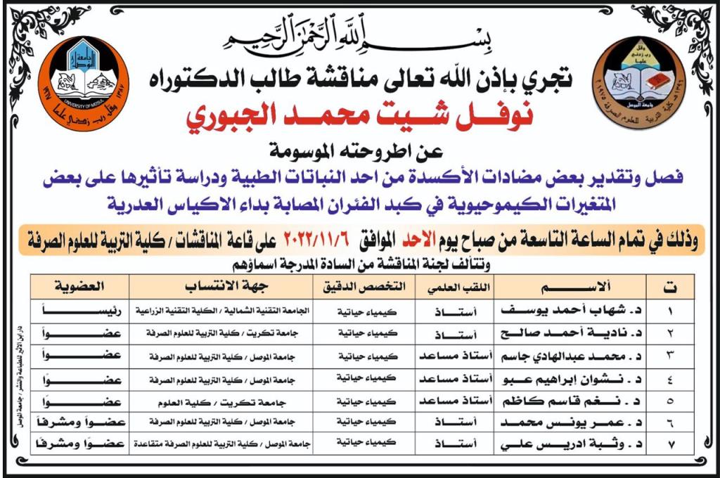 أطروحة دكتوراه في كلية التربية للعلوم الصرفة بعنوان” فصل وتقدير بعض مضادات الأكسدة من أحد النباتات الطبيَّة ودراسة تأثيرها على بعض المتغيرات الكيموحيوية في كبد الفئران المصابة بداء الأكياس العدرية “.نوقشت في كلية التربية للعلوم الصرفة بجامعة الموصل أطروحة الدكتوراه الموسومة ” فصل وتقدير بعض مضادات الأكسدة من أحد النباتات الطبيَّة ودراسة تأثيرها على بعض المتغيرات الكيموحيوية في كبد الفئران المصابة بداء الأكياس العدرية “،اليوم الاحد المصادف 6 تشرين الثاني 2022، حضر جانبا منها السيد عميد الكلية الأستاذ المساعد الدكتور قيس إسماعيل إبراهيم المحترم والسيد رئيس قسم الكيمياء المحترم وعدد من تدريسيي الكلية.تناولت الدراسة التي تقدم بها الطالب نوفل شيت محمد الجبوري في قسم الكيمياء حقن ذكور الجرذان بـــ 2000 رؤيس أولي حي لكل جرذ في المجاميع كلها عدا مجموعة السيطرة السالبة ولمدة ثلاثة اشهر، وبعد تشريحها تبيّن إنَّ الإصابة بالأكياس العدرية ظهرت في نسيج الكلى.تضمَّنت الدراسة أيضاً تنقية أنزيم بولي أمين وأوكسيديز جزئياً من مستخلص كلى ومصل دم ذكور الجرذان المصابة بداء الاكياس العدرية،صممت تجربة ثانية لدراسة تأثير تراكيز مختلفة لمستخلص أوراق نبات البيزيا وعقار البيندازول، إذ حقنت ذكور الفئران بـــ 2000 رؤيس أولي في المجاميع كلها لمدة شهرين ما عدا مجموعة السيطرة السالبة.تم دراسة إمكانية تثبيط مستخلص أوراق نبات البيزيا على أنزيم بولي أمين أوكسيديز المُنقى جزئياً من كلى ومصل دم ذكور الجرذان كذلك دراسة التأثير التثبيطي لعقار البيندازول على فعالية الانزيم المُنقى من كلى الجرذان.كذلك تم الكشف عن المركبات الفينولية الموجودة في مستخلص أوراق نبات البيزيا باستعمال تقنية كروماتوغرافيا السائل_عالي الأداء HPLC.تراس لجنة المناقشة الاستاذ الدكتور شهاب احمد يوسف البجاري من الجامعة التقنية الشمالية /الكلية التقنية الزراعية وعضوية كل من الاستاذ الدكتور نادية احمد صالح / جامعة تكريت /كلية التربية للعلوم الصرفة, الاستاذ المساعد الدكتور محمد عبد الهادي جاسم، الاستاذ المساعد الدكتور نشوان ابراهيم عبو؛ الاستاذ المساعد الدكتور نغم قاسم كاظم من جامعة تكريت/ كلية العلوم وبإشراف وعضوية كل من الاستاذ الدكتور عمر يونس محمد والاستاذ الدكتور وثبة ادريس علي.وتم قبول أطروحة الدكتوراه فالف مبروك للطالب والمشرفين والكلية على هذا الإنجاز العلمي.