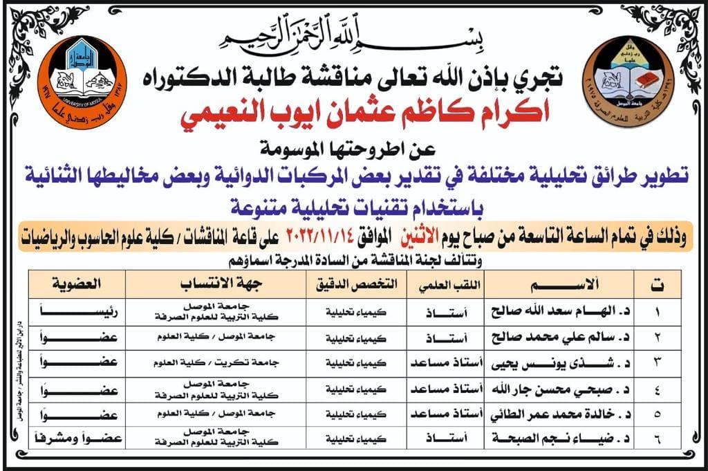 أطروحة دكتوراه في كلية التربية للعلوم الصرفة بعنوان” تطوير طرائق تحليلية مختلفة في تقدير بعض المركبات الدوائية وبعض مخاليطها الثنائية باستخدام تقنيات تحليلية متنوعة”.نوقشت في كلية التربية للعلوم الصرفة بجامعة الموصل أطروحة الدكتوراه الموسومة ” تطوير طرائق تحليلية مختلفة في تقدير بعض المركبات الدوائية وبعض مخاليطها الثنائية باستخدام تقنيات تحليلية متنوعة”،اليوم الاثنين المصادف 14 تشرين الثاني 2022، حضر جانبا منها السيد عميد الكلية الأستاذ المساعد الدكتور قيس إسماعيل إبراهيم المحترم والسيد المعاون العلمي والمعاون الاداري المحترمين والسيد رئيس قسم الكيمياء المحترم وعدد من تدريسيي الكلية.تناولت الدراسة التي تقدمت بها الطالبة اكرام كاظم عثمان النعيمي في قسم الكيمياء وفي ستة فصول مراجعة للطرائق التحليلية المستخدمة في تقدير المركبات الدوائية المدروسة المتمثلة بالأدرينالين والمثيل دوبا والدوبامين هيدروكلوريد والاتورفاستاتين الكالسيوم والروزيوفاستاتين الكالسيوم والسمفاستاتين والثايمول والباراسيتامول والفنيل فرين هيدروكلوريد والاوميبرازول والايزوميبرازول مغنيسيوم والبانتوبرازول صوديوم وذلك باستخدام تقنيات متنوعة شملت الطيفية والكروماتوغرافية والفلورومترية والكهربائية.وتطوير طريقة طيفية لتقدير الأدرينالين والمثيل دوبا والدوبامين هيدروكلوريد بأشكالهم النقية وفي مستحضراتهم الصيدلانية، استندت الطريقة على مبدأ أكسدة تلك الأدوية بزيادة محسوبة من العامل المؤكسد –N بروموسكسينميد في وسط حامض الهيدروكلوريك والمتبقي منه يعمل على قصر لون صبغة الكالكونواشتملت الدراسة ايضا تطوير طريقة طيفية لتقدير الاتورفاستاتين الكالسيوم والروزيوفاستاتين الكالسيوم والسمفاستاتين بأشكالهم النقية وفي المستحضرات الصيدلانية، اعتمدت الطريقة على استعمال صبغة التروبيولين OO بوصفها كاشفاً كروموجينياً لتكوين معقدات التجمع الأيوني مع المركبات وتطوير طريقتين طيفيتين حساستين لتقدير كميات مايكروغرامية من الثايمول تعتمد كلا الطريقتين على تطبيق تقنية استخلاص النقطة السحابية بوجود عامل الشد السطحي .Triton X-114وتناولت الدراسة ايضا طريقة طيفية اقتصادية في التقدير الآني للباراسيتامول والفنيل فرين هيدروكلوريد في الخليط ، وذلك بتطبيق طريقة الإضافة القياسية – النقطة المشتركة (HPSAM) واستحداث طريقة فلورومترية لتقدير الاوميبرازول والايزوميبرازول والبانتوبرازول بالاعتماد على مفاعلتهم مع صبغة الايوسينY كصبغة تفلورية لتكوين معقدات المزدوج الايوني غير المتفلورة في وسط محلول الخلات المنظم.تراس لجنة المناقشة الاستاذ الدكتور الهام سعدالله صالح وعضوية كل من الاستاذ الدكتور سالم علي محمد صالح من كلية العلوم, الاستاذ المساعد الدكتور شذى يونس يحيى من جامعة تكريت /كلية العلوم، الاستاذ المساعد الدكتور صبحي محسن جارالله، الاستاذ المساعد الدكتور خالدة محمد عمر الطائي / كلية العلوم وبإشراف وعضوية الاستاذ الدكتور ضياء نجم الصبحة.وتم قبول أطروحة الدكتوراه فالف مبروك للطالبة والمشرف والكلية على هذا الإنجاز العلمي.