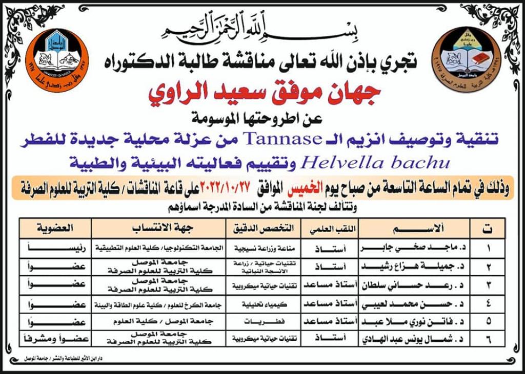 أطروحة دكتوراه في كلية التربية للعلوم الصرفة بعنوان” تنقية وتوصيف إنزيم الـ Tannase من عزلة محلية للفطر Helvella bachu وتقييم فعاليته البيئية والطبية “.نوقشت في كلية التربية للعلوم الصرفة بجامعة الموصل أطروحة الدكتوراه الموسومة ” تنقية وتوصيف إنزيم الـ Tannase من عزلة محلية للفطر Helvella bachu وتقييم فعاليته البيئية والطبية “،اليوم الخميس المصادف 27 تشرين الاول 2022، حضر جانبا منها السيد معاون العميد للشؤون العلمية الاستاذ المساعد الدكتور ياسر يحيى قاسم المحترم والسيد رئيس قسم علوم الحياة المحترم وعدد من تدريسيي الكلية.تضمنت الدراسة التي تقدمت بها الطالبة جهان موفق سعيد الراوي في قسم علوم الحياة الكشف عن توليفة فريدة متنوعة من الفطريات التي أعطت قدرات مختلفة بالغربلة الأولية عند الكشف عن إنتاج إنزيم التانيز, وبدأ واضحاَ تفوق العزلة ذات الرمز العلمي J75 التي أعطت أعلى قطر لهالة التحلل بلغ 9.2 ملم في غضون 5 أيام. بعد استخلاص الحامض النووي من الخيوط الفطرية وإجراء تفاعل البلمرة المتسلسل وتحليل التتابعات النيوكليوتيدية وإدخالها في موقع NCBI تبين بأنها تعود للنوع Helvella bachu, وبعد صبر وعمل جاد سجلت في بنك الجينات لأول مرة على مستوى العراق وبالمرتبة الثانية على مستوى العالم بعد العزلة الصينية بالرقم التسلسلي OL454919.1.تهدف الدراسة الى التقليل أو إيقاف التهديدات التي تتعرض لها الأنظمة البيئية, جاء في طليعة التطبيقات التي استغلت فيها الكتلة الحيوية للعزلة الفطرية المنماة على وسط اللكنين الصلب أحدثت إذابة كاملة لقطع الفحم المنخفض الجودة المنتشرة على سطح الوسط وحولتها الى قطيرات زيتية, وفي الأوساط المغمورة استطاعت الكتلة الحيوية إذابة قطع الفحم وتحويلها الى سائل اسود اللون وأحدثت تغيير في تركيب الفحم.ولاعادة الروح الى الأبحاث العلمية, استغل الإنزيم في مجموعة واسعة من التطبيقات, ولأن معظم الإهتمام في الوقت الراهن وجه مباشرة لإستخدام الفطريات في إنتاج مركبات ذات أهمية طبية, فقد إتضح أن إنزيم التانيز المنقى يتمتع بخصائص فعالة ضد العديد من الأنواع البكتيرية,أتاح هذا العمل التعرف على عالم الفطريات عن كثب وأن ما حقق من إنجاز علمي في مهمة شاقة قد يظن الكثيرون انها أقرب الى المستحيل يمثل خطوة رائدة يضاف للنهر الجارف المتجدد يومياً من الاكتشافات العلمية الحديثة املاً أن تساهم هذه الرؤية في تسهيل العمل للباحثين الاخرين.تراس لجنة المناقشة الاستاذ الدكتور ماجد صخي جابر من الجامعة التكنولوجية/كلية العلوم التطبيقية وعضوية كل من الاستاذ الدكتورة جميلة هزاع رشيد , الاستاذ المساعد الدكتور رعد حساني سلطان, الاستاذ المساعد الدكتور حسن محمد لعيبي من جامعة الكرخ للعلوم /كلية علوم الطاقة والبيئة, الاستاذ المساعد الدكتورة فاتن نوري ملا عبد من كلية العلوم وبإشراف وعضوية الاستاذ الدكتورة شمال يونس عبد الهادي.وتم قبول أطروحة الدكتوراه فالف مبروك للطالبة والمشرفة والكلية على هذا الإنجاز العلمي.