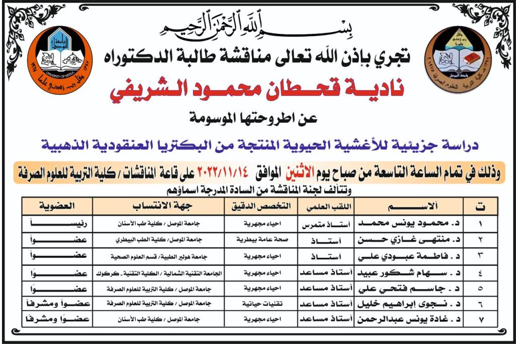 اطروحة دكتوراه في كلية التربية للعلوم الصرفة بعنوان” دراسة جزيئية للأغشية الحيوية المنتجة من البكتريا العنقودية الذهبية “.نوقشت في كلية التربية للعلوم الصرفة بجامعة الموصل أطروحة الدكتوراه الموسومة ” دراسة جزيئية للأغشية الحيوية المنتجة من البكتريا العنقودية الذهبية “،اليوم الاثنين المصادف 14 تشرين الثاني 2022، حضر جانبا منها السيد عميد الكلية الأستاذ المساعد الدكتور قيس إسماعيل إبراهيم المحترم والسيد رئيس قسم علوم الحياة المحترم وعدد من تدريسيي الكلية.تضمنت الدراسة التي تقدمت بها الطالبة نادية قحطان محمود في قسم علوم الحياة جمع (200) عينة من الانف واليدين للعاملين في مجال طب الاسنان ( اطباء الاسنان والمساعدين ) في المستشفى التعليمي لكلية طب الاسنان- جامعة الموصل وللفترة من 17 كانون الاول2020 الى 9 شباط 2021.تم تشخيص العزلات بالاعتماد على الصفات المزرعية و الفحص المجهري و الاختبارات الكيموحيوية واستخدام جهاز الفايتك Vitek 2 compact لتأكيد النوع، حيث اظهرت 66 عزلة; 32 من اليدين و34 من الانف، قابليتها على تخمر سكر المانيتول،تم تحديد حساسية العزلات المختلفة لمضاد Oxacillin باستخدام Minimum Inhibitory Concentration وباستخدام جهاز الفايتك وذلك لكون مضاد الاوكساسلين يماثل المثيسلين بالجهاز، وتبين اختلاف العزلات في مقاومتها لهذا المضاد الحيوي.من ناحية اخرى تم تحديد حساسية العزلات المختلفة للمضادات الحيوية بحسب طريقة Kirby – Bauer وباستخدام سبعة انواع من المضادات اذ اظهرت جميع عزلات Staphylococcus مقاومتها للاوكساسلين والمثيسلين وبنسبة 100% ماعدا عزلات S. saprophyticus فكانت نسبة المقاومة 50%.تناولت الدراسة التحري عن الجينات المقاومة للمضادات الحيوية والمطهرات تبين ان جميع العزلات الستة المدروسة لم تكن تحتوي على الجينqacA B، بينما كانت مالكة للجين smr بنسبة مئوية بلغت (16.6)%………………………..تراس لجنة المناقشة الاستاذ المتمرس الدكتور محمود يونس محمد من كلية طب الاسنان وعضوية كل من الاستاذ الدكتور منتهى غازي حسن / كلية الطب البيطري , الاستاذ الدكتور فاطمة عبودي علي من جامعة هولير الطبية /قسم العلوم الصحية, الاستاذ المساعد الدكتور سهام شكور عبيد من الجامعة التقنية الشمالية / الكلية التقنية – كركوك, الاستاذ المساعد الدكتور جاسم فتحي علي وبإشراف وعضوية كل من الاستاذ المساعد الدكتور نجوى ابراهيم خليل البرهاوي والاستاذ المساعد الدكتور غادة يونس عبد الرحمن من كلية طب الاسنان.وتم قبول أطروحة الدكتوراه فالف مبروك للطالبة والمشرفتين والكلية على هذا الإنجاز العلمي.