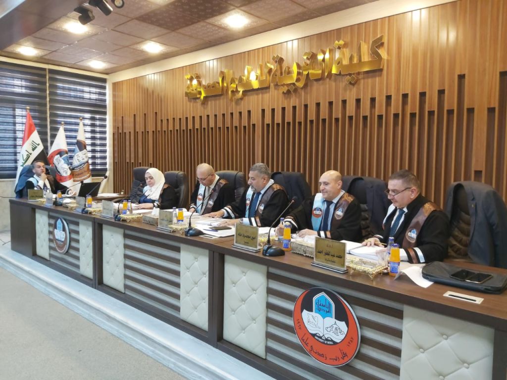 تراس لجنة المناقشة السيد معاون عميد كلية التربية للعلوم الصرفة للشؤون العلمية الأستاذ المساعد الدكتور ياسر يحيى قاسم وعضوية كل من الأستاذ المساعد الدكتور مالك حسين خضر من جامعة الحمدانية/كلية التربية والمدرس الدكتور علي بشير عزيز من كلية علوم البيئة وتقاناتها وبإشراف وعضوية الاستاذ الدكتور مشتاق عبد داود الجبوري.