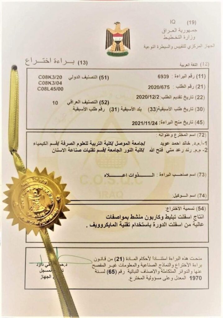 رسالة ماجستير في كلية التربية للعلوم الصرفة بعنوان دراسةٌ فسلجيَّةٌ لعزلةٍ محليَّةٍ مِن السيانوبكتريا Fischerella musciola المُشَخَّص جزئيًا واختبارُ الفعاليَّةِ ضدَ المايكروبيَّةِ لمُستخلصاتِ الكتلةِ الحيويَّةِ.ناقشت كلية التربية للعلوم الصرفة بجامعة الموصل رسالة الماجستير الموسومة ” دراسةٌ فسلجيَّةٌ لعزلةٍ محليَّةٍ مِن السيانوبكتريا Fischerella musciola المُشَخَّص جزئيًا واختبارُ الفعاليَّةِ ضدَ المايكروبيَّةِ لمُستخلصاتِ الكتلةِ الحيويَّةِ “،اليوم الاثنين 20 كانون الأول 2021، حضر جانبا منها الأستاذ المساعد الدكتور قيس إسماعيل إبراهيم المحترم عميد الكلية والسيد المعاون العلمي والمعاون الإداري المحترمين والسيد رئيس قسم علوم الحياة وعدد من تدريسيي الكلية.تضمنت هذه الرسالة التي تقدمت بها الطالبة رشا خطاب عمر خطاب الدليمي في قسم علوم الحياة عزل لسلالة fischerella من البيئة المحلية (بحيرة سد الموصل) وتم اجراء تشخيص جزيئي لهذه السلالة للتأكد من تصنيفها وتشخيصيها وراثيا، إذ أكدت النتائج ان العزلة المستحصل عليها هي عزلة تابعة لعائلة Hapalosiphonaceae فالاسم العلمي الدقيق لها musciola fischerella وذلك من خلال تحديد تسلسل القواعد النتروجينية لنواتج التفاعل التضاعفي لعينة DNA التابعة لهذه العزلة مع عزلة قياسية.تم اجراء تجارب فسلجية لدراسة تأثير بعض العوامل على نمو العزلة المدروسة وقابليتها على تكوين كتلة حيوية، أظهرت النتائج إن افضل وسط زرعي يدعم نمو العزلة المدروسة هو وسط Chu10 ، إذ بلغت اقصى قيمة لكتلته الحيوية(390) ملغم/لتر والمحتوى الكلوروفيلي (19) ملغم /لتر والمحتوى البروتيني (109) ملغم /لتر والمحتوى الكربوهيدراتي (72) ملغم /لتر عند استخدام هذا الوسط وارتفع الأس الهيدروجيني النهائي (8.87) عن الأس الهيدروجيني الاولي.أظهرت النتائج ان افضل فترة تحضين لنمو العزلة هي (20) يوم إذ بلغت قيمة الكتلة الحيوية (632) ملغم/لتر في اليوم لعشرين من التحضين وبلغ المحتوى الكلوروفيلي أقصاه (33)ملغم/لتر والمحتوى البروتيني (381)ملغم/لتر والمحتوى الكربوهيدراتي (122) ملغم/لتر في اليوم العشرين من التحضين، ارتفع الأس الهيدروجيني النهائي عن الاس الهيدروجيني ليبلغ (9.01) في اليوم ال 20 من التحضين .أظهرت النتائج ان افضل سرعة رج للتهوية (75) دورة/دقيقة دعمت افضل نمو وكتلة حيوية (601) ملغم/لتر وبلغ المحتوى الكلوروفيلي أقصاه (32) ملغم/ لتر عند هذهِ السرعة المحددة من الرج وكذلك المحتوى البروتيني (280)ملغم/لتر والمحتوى الكربوهيدراتي (173)ملغم/لتر واقصى ارتفاع للأس الهيدروجيني النهائي (8.69) سُجل عند سرعة الرج هذه. بينت النتائج إن إضافة مادة Nacl بتركيز(0.1) ملغم/لتر الى وسط النمو دعم افضل نمو وكتلة حيوية (558) ملغم/لتر للعزلة المدروسة وأيضا حقق افضل محتوى كلوروفيلي (29) ملغم/لتر وافضل محتوى بروتيني (211) ملغم/لتر ومحتوى كاربوهيدراتي (131) ملغم/ لتر وسجلت اعلى قيمة للاس الهيدروجيني النهائي عند هذه التراكيز من الملوحة .بينت النتائج ان الظروف الزراعية المثلى مجتمعة دعمت النمو والكتلة الحيوية بشكل واضح (672) ملغم/لتر ودعمت افضل محتوى كلوروفيلي(41) ملغم/ لتر ومحتوى بروتيني (338) ملغم/ لتر ومحتوى كاربوهيدراتي (165) ملغم /لتر وبلغ الاس الهيدروجيني النهائي أقصاه (9.01) تحت هذه الظروف.تم تحضير مستخلصات مختلفة (المستخلص العضوي، المستخلص الايثانولي المستخلص الأسيتوني) من الكتلة الحيوية للعزلة المدروسة، تم اختبار تراكيز محددة من هذه المستخلصات على اجناس بكتريا مرضية عزلت من المستشفيات المحلية لمدينة الموصل(Staph aureus، Proteus mirabilis، Klepsella pneumonia، Escherichia coli ،Pseudomonas aeruginosa) .أظهرت النتائج ان المستخلص العضوي كان افضل مستخلص في قابليته على تثبيط نمو البكتريا المرضية المدروسة إذ بلغ قطر التثبيط عند التركيز (100) مايكرو غرام/مل(12) للبكتريا المرضية S.aureus و (10) للبكتريا المرضية P.mirabilis و(9) للبكتريا المرضية K.pneumonia و(8) للبكتريا المرضية P. aeruginosa و(8) للبكتريا المرضية E.coli على التوالي.وازداد قطر التثبيط مع زي