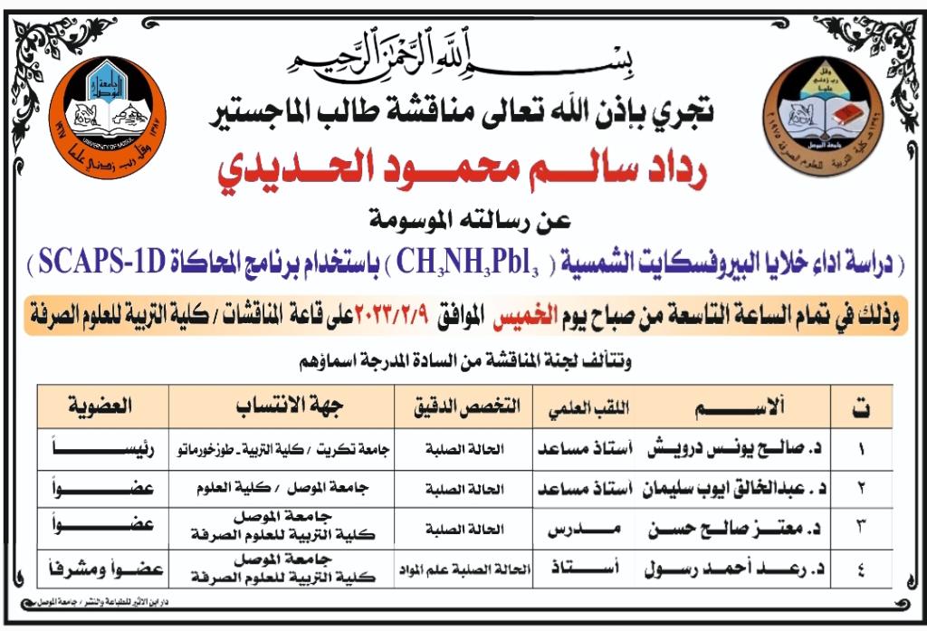 رسالة ماجستير في كلية التربية للعلوم الصرفة بعنوان” دراسةُ أَداءِ خلايا البيروفسكايت الشمسيَّةِ (CH3NH3PbI3) باستخدامِ برنامجِ المُحَاكَاةِ SCAPS-1D “.نوقشت في كلية التربية للعلوم الصرفة بجامعة الموصل رسالة الماجستير الموسومة ” دراسةُ أَداءِ خلايا البيروفسكايت الشمسيَّةِ (CH3NH3PbI3) باستخدامِ برنامجِ المُحَاكَاةِ SCAPS-1D “،اليوم الخميس المصادف 9 شباط 2023، حضر جانبا منها السيد رئيس جامعة الموصل الاستاذ الدكتور قصي كمال الدين الاحمدي المحترم والسيد عميد الكلية الأستاذ المساعد الدكتور قيس إسماعيل إبراهيم المحترم والسيد رئيس قسم الفيزياء المحترم وعدد من تدريسيي الكلية.تضمنت هذه الدراسة التي تقدم بها الطالب رداد سالم محمود الحديدي في قسم الفيزياء تركيب هيكل الخلية الشمسية ذات أَعلى كفاءة نسبة الى الخلايا الاخرى والمكونة من خمس واختيار الطبقة الأَفضل الَّتي تكون عندها كفاءة الخلية الشمسية أَعلى ما يكون،وتم في هذه الدراسة استخدام البرنامج الحاسوبي SCAPS-1D لمحاكاة هياكل الخلايا الشمسية، بعد تثبيت كل طبقة للخلية الشمسية تمت دراسة تأثير تغيير سمك الطبقة المختارة على مخرجات الخلية الشمسية وهي فولتية الدائرة المفتوحة (VOC) وعامل المليء(FF) وكثافة تيار دائرة القصر (JSC) وكفاءة الخلية (ƞ)،كذلك تم دراسة تأثير إِضافة الطبقة النافذة على سُمك الطبقة الموائمة ووجد أَنَّها تُساعد على تقليل سُمك الطبقة الموائمة؛ ودراسة تأثير تغيير درجة الحرارة على معلمات الخلية الشمسية، وتبيَّن أَنَّ كفاءة الخلية الشمسية ƞ تتناقص مع زيادة درجات الحرارة.تراس لجنة المناقشة الأستاذ المساعد الدكتور صالح يونس درويش من جامعة تكريت/ كلية التربية-طوزخورماتو وعضوية كل من الأستاذ المساعد الدكتور عبد الخالق أيوب سليمان من كلية العلوم والمدرس الدكتور معتز صالح حسن وبإشراف وعضوية الأستاذ الدكتور رعد احمد رسول.وتم قبول رسالة الماجستير فالف مبروك للطالب والمشرف والكلية على هذا الإنجاز العلمي.