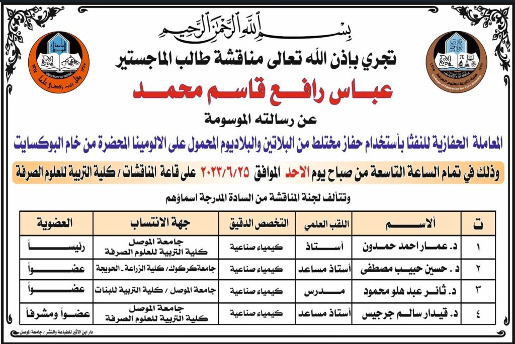 موعد مناقشة أطروحة دكتوراه -قسم الكيمياء