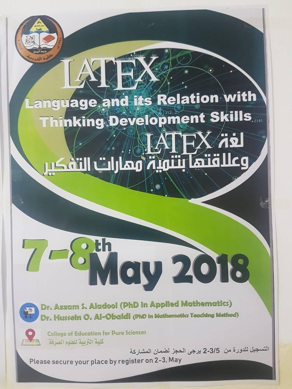 برعاية عمادة كلية التربية للعلوم الصرفة اقامت وحدة التاهيل والتوظيف والمتابعة – قسم الرياضيات دورة تدريبية بعنوان(LATEX) وعلاقتها بتنمية مهارات التفكير على مدار يومين٧_٨ ايار٢٠١٨ اليوم الاول LATEXالطباعية ومجالات استخدامها القاها الدكتور عزام صلاح الدين اليوم الثاني محاضرة بعنوان كيفية كتابة الرموز والمعادلات الرياضية فيLATEX القاها الدكتور حسين عبيد مع تمنياتنا للجميع بالنجاح والتوفيق لكليتنا وجامعتنا الحبيبة