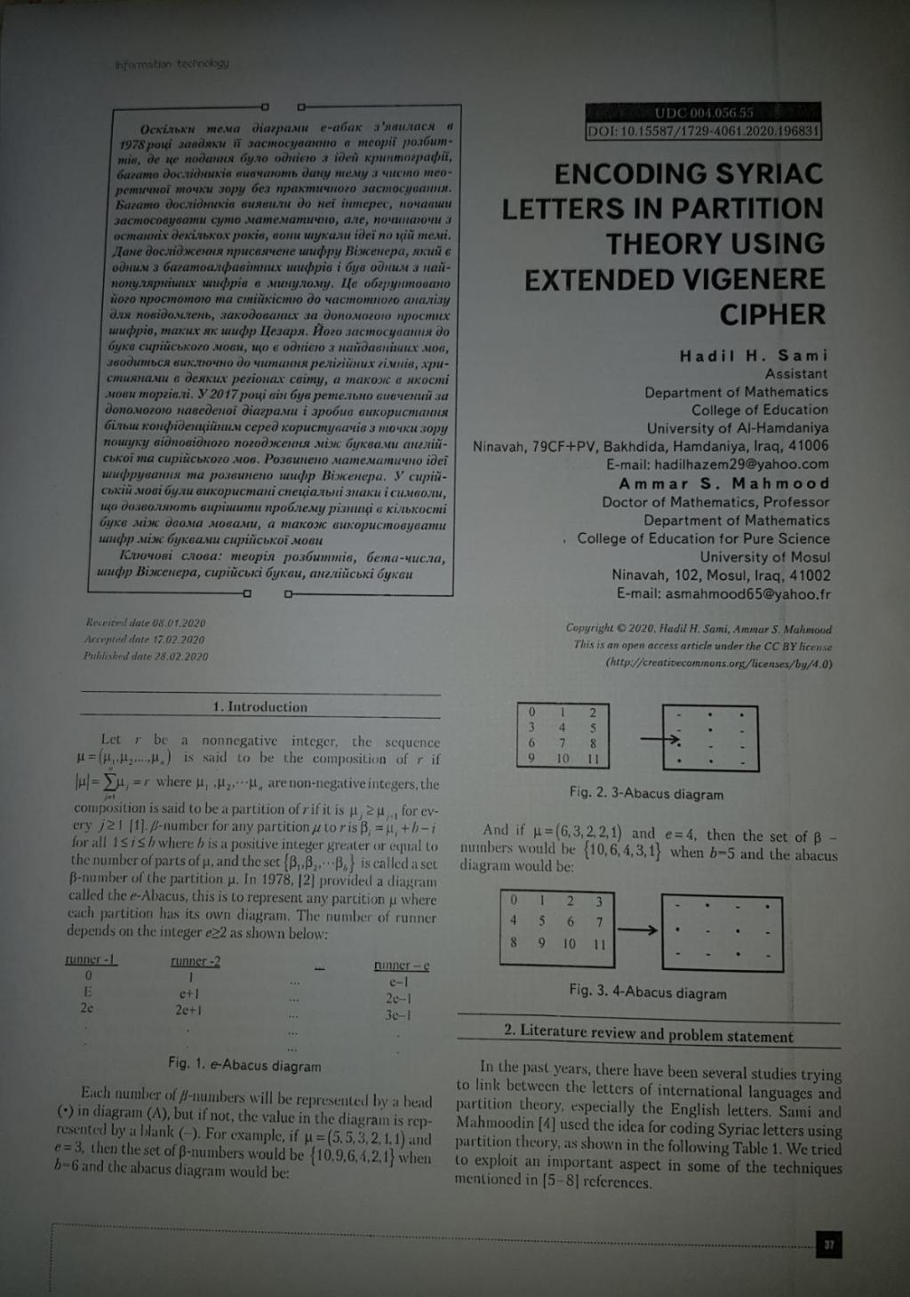 ( Encoding Syriac letters in partition theory using Extended Vigenere Cipher )في مجلة اوكرانية مندرجة ضمن مستوعبات سكوبس Q3