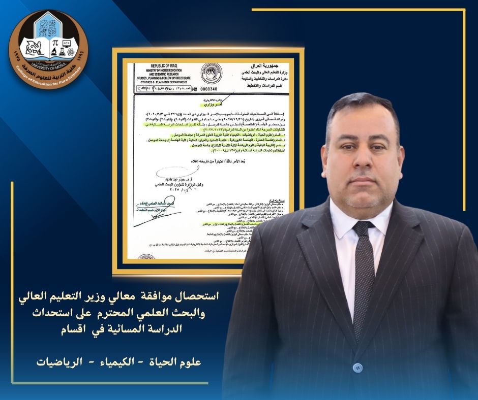 برعاية السيد رئيس جامعة الموصل المحترم الاستاذ الدكتور قصي كمال الاحمدي وضمن النشاطات التي تجريها عمادة كلية التربية للعلوم الصرفة من اجل الارتقاء والطموح في مستوى الطرح والموضوعية اقيمت ورشة عمل بعنوان هندسة التعليم الجامعي الفعال في قاعة الخوارزمي صباح هذا اليوم ٢٧-٣-٢٠١٩ لقسم علوم الحياة وبحضور السيد العميد الاستاذ المساعد الدكتور قيس اسماعيل ابراهيم ومعاونية ورئيس قسم علوم الحياة الدكتور عدنان المحترم حيث القى المحاضرة الدكتورة مآرب وبحضور مجموعة الاساتذه المحترمون حيث تخللها مداخلات ومناقشات قيمة