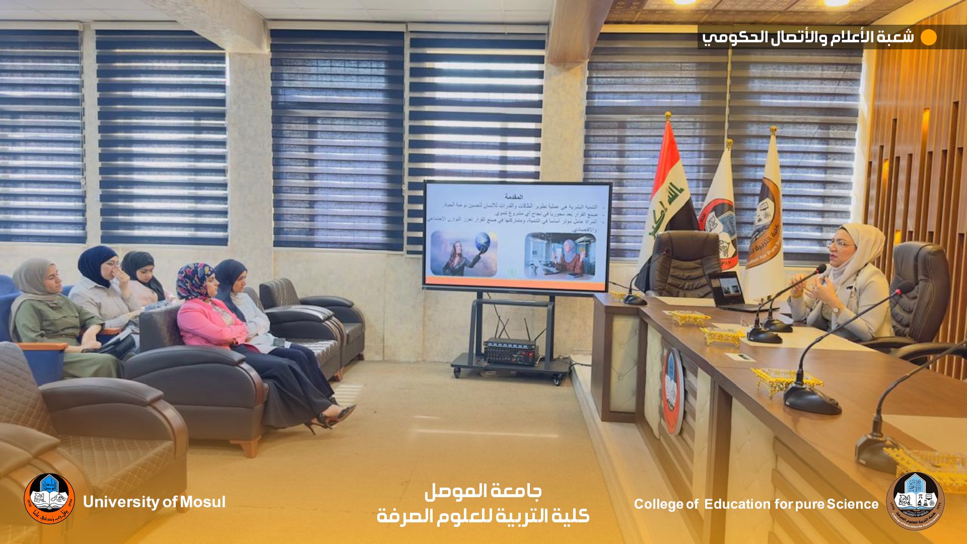برعاية السيد رئيس جامعة الموصل الاستاذ الدكتور وحيد محمود الإبراهيمي المحترم وبإشراف السيد عميد كلية التربية للعلوم الصرفة الاستاذ الدكتور جاسم فتحي علي المحترم اقامت كلية التربية للعلوم الصرفة وبالتعاون مع وحدة شؤون المرأة في رئاسة جامعة الموصل ورشة بعنوان” التنمية البشرية وصنع القرار وتعزيز قدرات المرأة” وذلك يوم الاثنين الموافق ٢٩ أيلول ٢٠٢٥ حاضر فيها المدرس المساعد لبنى محمد احمد هدفت الورشة الى التنمية البشرية للمرأة كالتعليم والتدريب والصحة وتعزيز الوعي الذاتي وزيادة قدرات المرأة في اتخاذ القرارات التي تؤثر على حياتها ومجتمعها.
