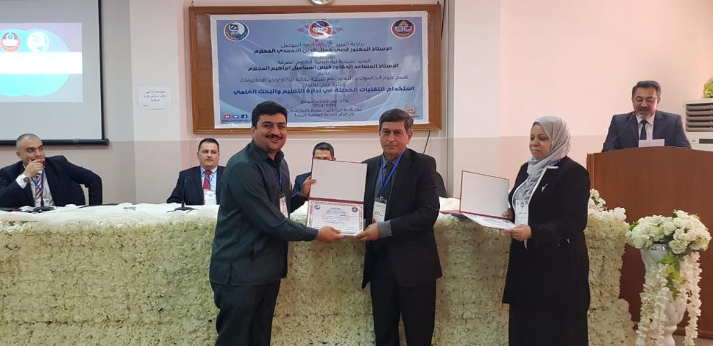 برعاية السيد رئيس جامعة الموصل الاستاذ الدكتور قصي كمال الدين الاحمدي المحترم وبأشراف عميد كلية التربية للعلوم الصرفة الاستاذ المساعد الدكتور قيس اسماعيل ابراهيم المحترم وبحضور المعاون العلمي لرئيس جامعة الموصل الاستاذ الدكتور مفيد ذنون يونس نظم قسم علوم الحاسوب ورشة عمل بعنوان " استخدام التقنيات الحديثة في ادارة التعليم والبحث العلمي " بالتعاون مع شركة طاقة لكنولوجيا المعلومات في 30-4-2019 وعلى قاعة كلية الاداب حيث تضمنت الورشة محاور علمية عدة ابرزهانظرة عامة حول نظام التعليم الالكتروني (moodle) للدكتور علي عبدالرزاق ونظام السيطرة على Git للاصدارات الموزعة (تقنية ادارة الملفات) للدكتور اوس خزعل علي ومقدمة تعريفية عن موقع بوابة الباحث العلمي (Research Gate ) للدكتور مروان سالم محمودوعلى هامش الورشة تم افتتاح معرض شركة طاقة لتكنلوجيا المعلومات وقد منحت شهادات تقديريةللمساهمين والداعمين في انجاحها.