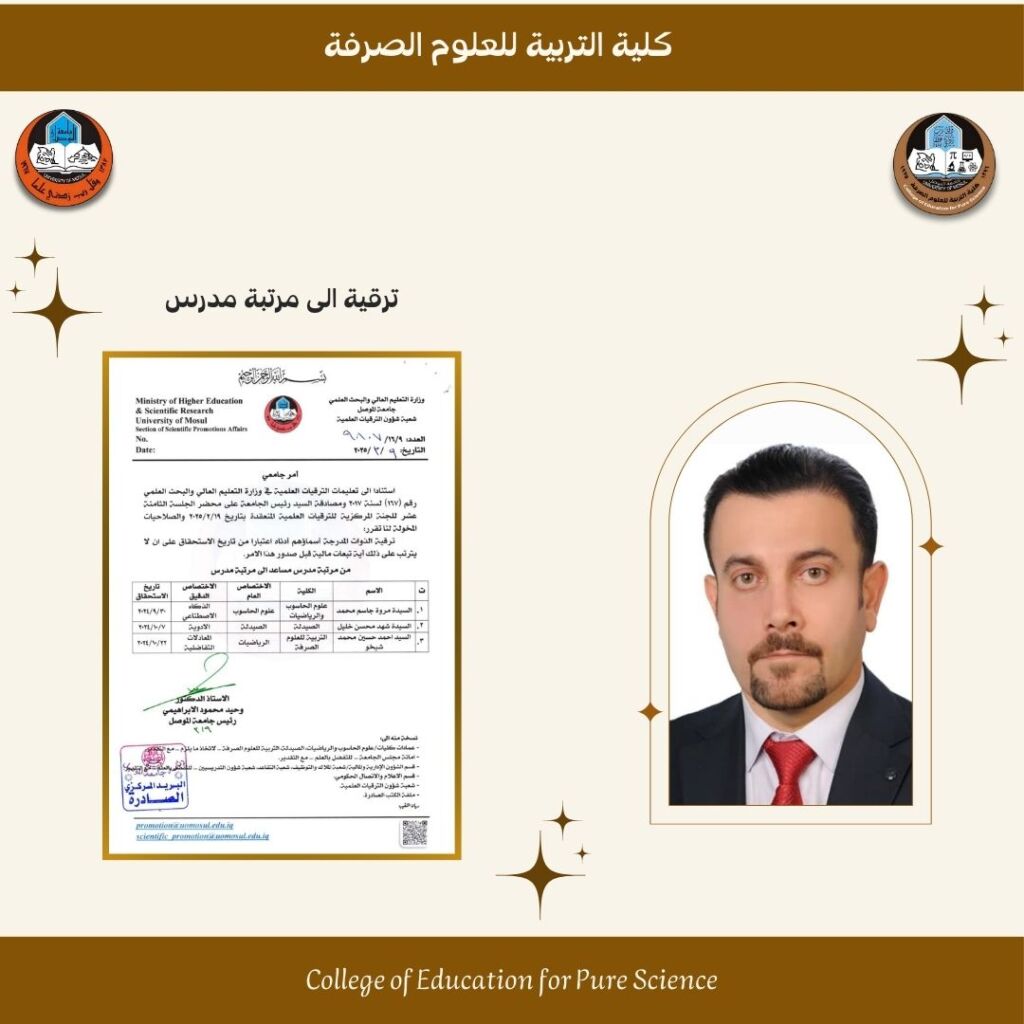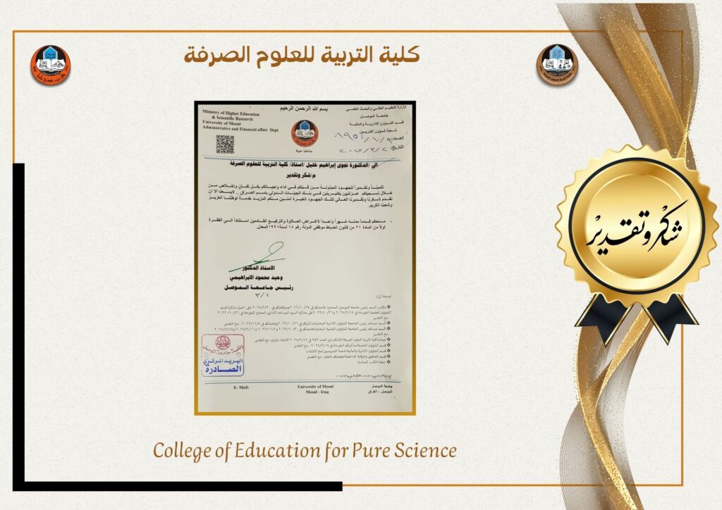 برعاية السيد رئيس جامعة الموصل الاستاذ الدكتور وحيد محمود الإبراهيمي المحترم وبإشراف السيد عميد كلية التربية للعلوم الصرفة الاستاذ الدكتور قيس اسماعيل ابراهيم المحترم اقامت كلية التربية للعلوم الصرفة ورشة عمل بعنوان ” الامتثال للقوانين والمعايير المهنية لطلاب قسم الكيمياء في كلية التربية للعلوم الصرفة واخلاقيات المهنة في تطبيق قانون انضباط الطلبة في مؤسسات وزارة التعليم العالي والبحث العلمي للعام الدراسي ٢٠٢٤-٢٠٢٥”