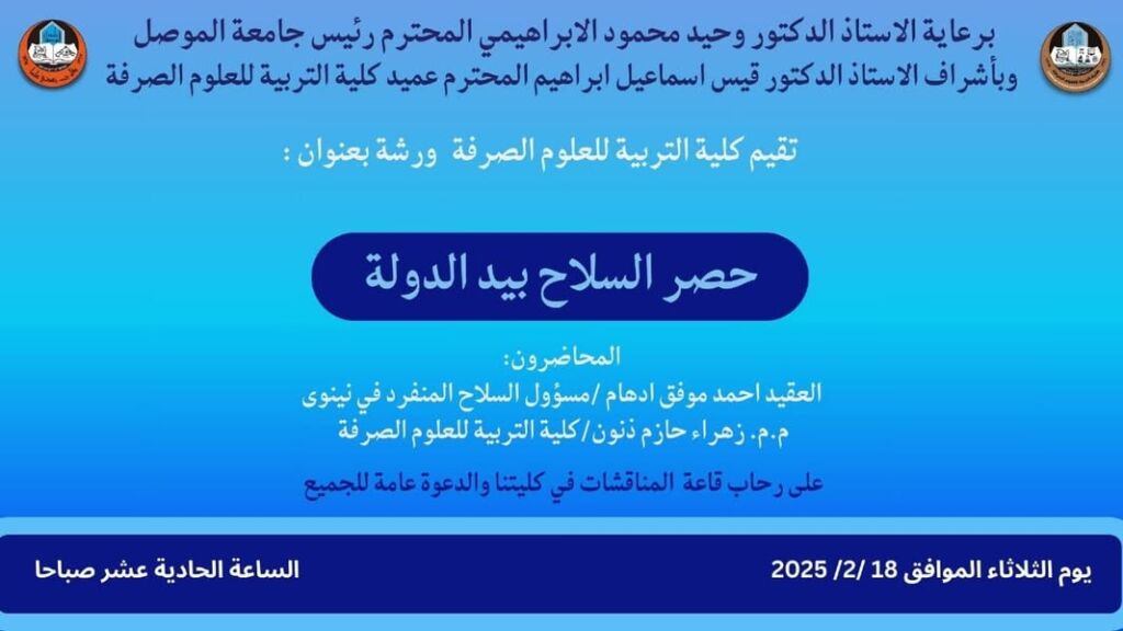 برعاية السيد رئيس جامعة الموصل الاستاذ الدكتور وحيد محمود الإبراهيمي المحترم وبإشراف السيد عميد كلية التربية للعلوم الصرفة الاستاذ الدكتور قيس اسماعيل ابراهيم المحترم اقامت كلية التربية للعلوم الصرفة ورشة عمل بعنوان ” حصر السلاح بيد الدولة” وذلك يوم الثلاثاء الموافق ١٨ شباط ٢٠٢٥ حاضر فيها: