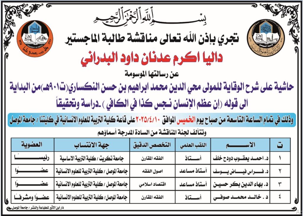 ناقشت كلية التربية للعلوم الإنسانية رسالة ماجستير عن أثر انموذج فينك (Fink) في تحصيل طلاب الصف الرابع العلمي لمادة القران الكريم والتربية الاسلامية وتنمية اندماجهم الدراسي ناقشت كلية التربية للعلوم الإنسانية في جامعة الموصل رسالة ماجستير عن يوم الاحد الموافق13/4/2025 حضر جانبا منها الأستاذ الدكتور حازم ذنون إسماعيل عميد الكلية ورئيس القسم الدكتور مضر حيدر محمود اليوزبكي وعدد من تدريسيي الكلية