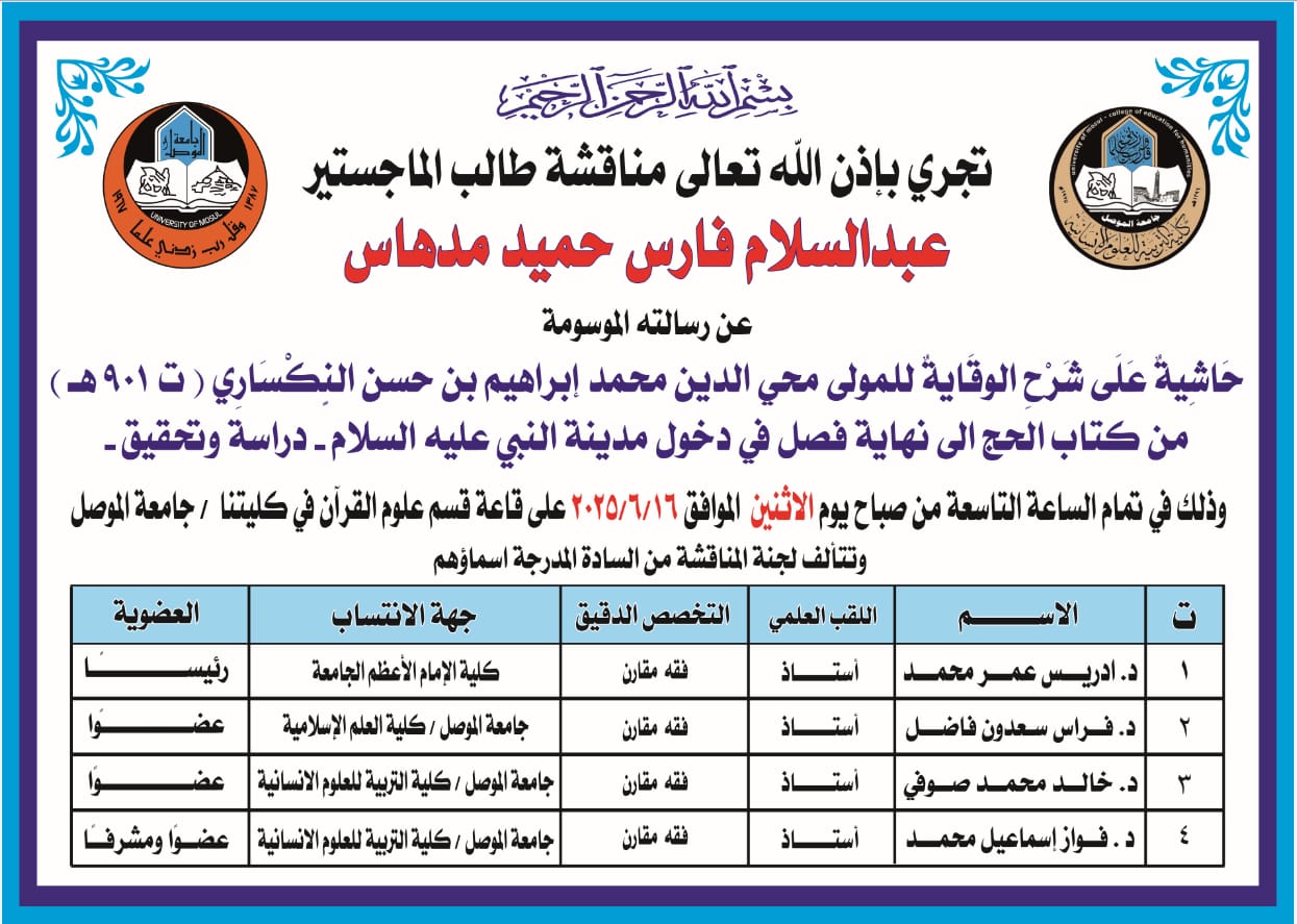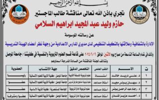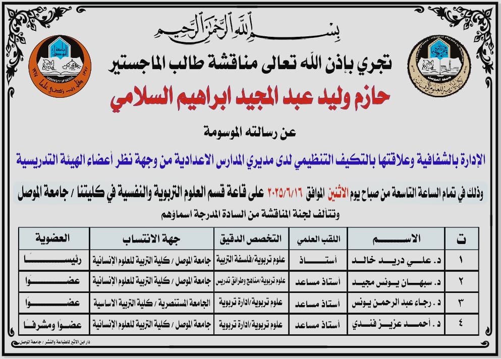 رسالة ماجستير في كلية التربية للعلوم الإنسانية/ قسم العلوم التربوية والنفسية بعنوان((سلوك العطاء وعلاقته بالحيوية الذاتية لدى طلبة جامعة الموصل )) يوم الاربعاء ٥ تشرين [إقرأ المزيد]