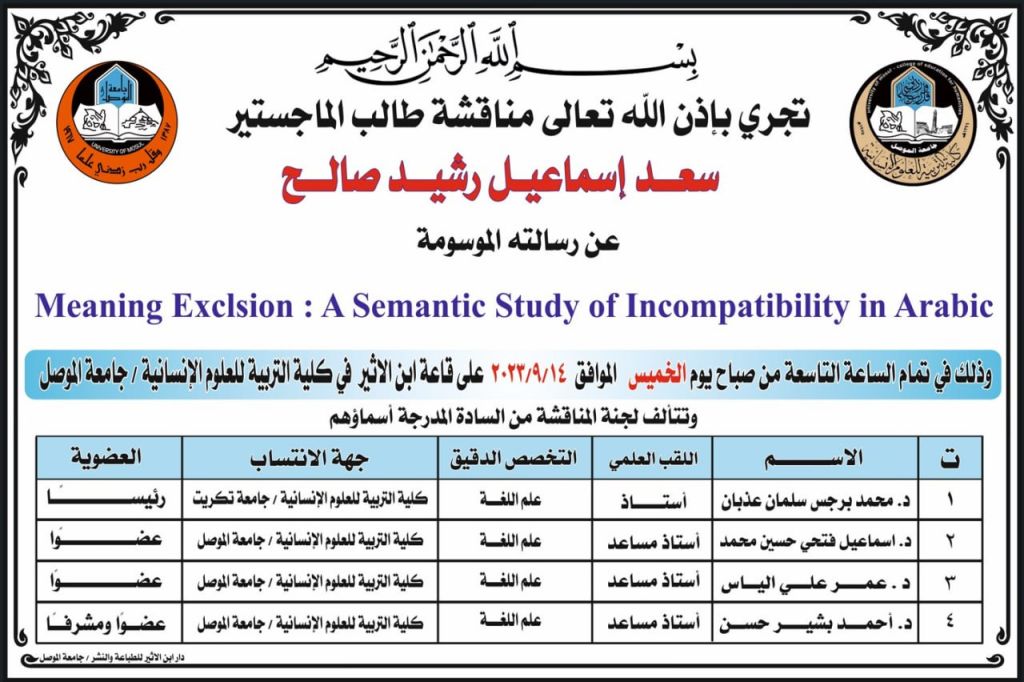 ناقشت كلية التربية للعلوم الإنسانية بجامعة الموصل رسالة ماجستير عن (التفسير التحليلي لآيات الأحكام في سورة البقرة بين الإمام الرازي وابن عاشور، الصيام والحج-دراسة مقارنة-)، يوم الخميس 14/9/2023، حضر جانبا منها الاستاذ الدكتور حازم ذنون إسماعيل عميد الكلية ورئيس القسم الدكتور مضر اليوزبكي وعدد من تدريسي الكلية.