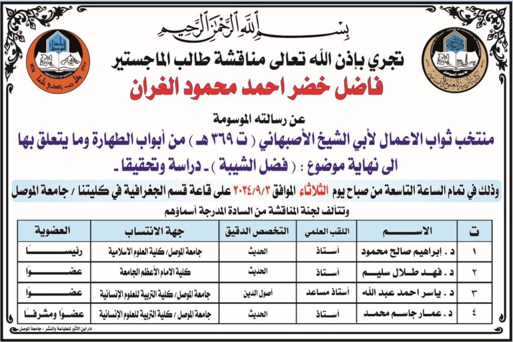ناقشت كلية التربية للعلوم الإنسانية في جامعة الموصل رسالة ماجستير(الجمع الحاوي في شرح البيضاوي للحاج عبدالله ابن الحاج محمد المعروف بالتوني جوق زادة (ت 1183 ه ) من بداية المخطوط إلى وجوه القراءات – دراسة وتحقيق – ) يوم الثلاثاء 27/8/2024 , حضر جانب منها الأستاذ الدكتور حازم ذنون إسماعيل عميد الكلية ورئيس القسم الدكتور مضر حيدر محمود اليوزبكي وعدد من تدريسي الكلية.