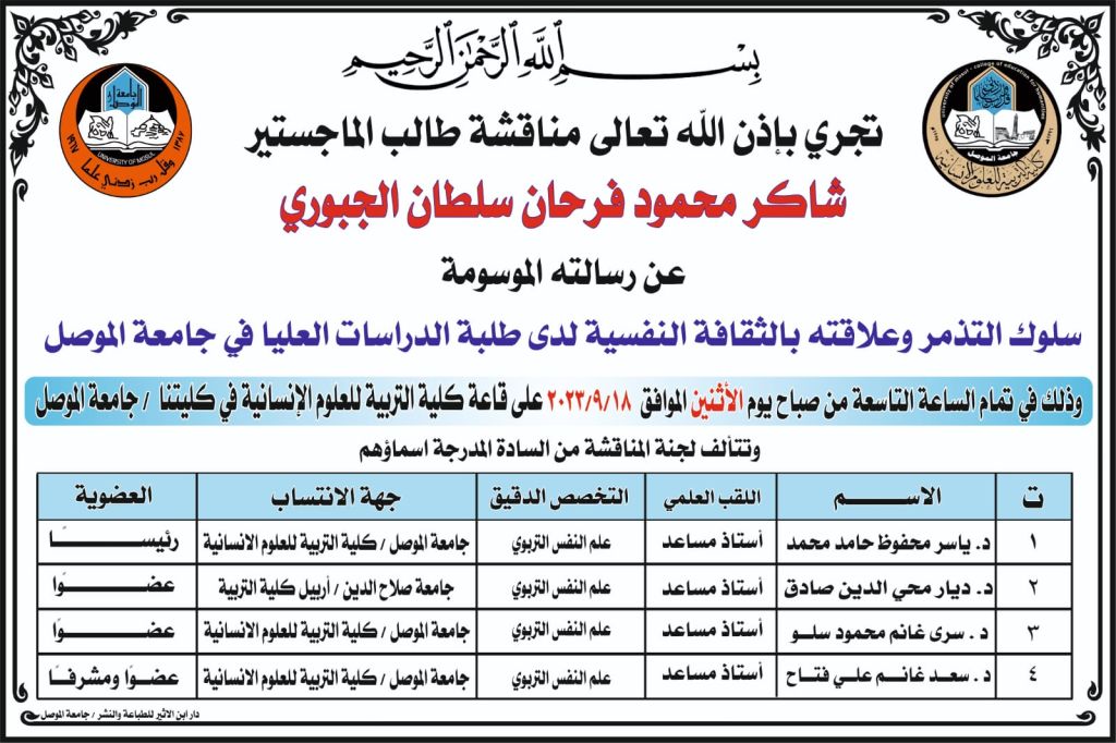 ناقشت كلية التربية للعلوم الانسانية بجامعة الموصل رسالة ماجستير عن الفجوة الرقمية في دول الشرق الاوسط دراسة في الجغرافية السياسية