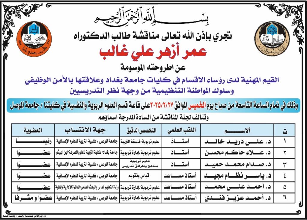 ترأس لجنة المناقشة الاستاذ الدكتور فواز اسماعيل محمد