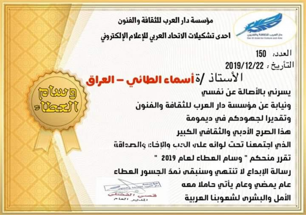 تم تكريم طالبة الدكتوراه في قسم اللغة العربية (أسماء مشعل يونس الطائي) بوسام العطاء لعام 2019م من مؤسسة دار العرب للثقافة والفنون إحدى تشكيلات الاتحاد العربي للإعلام الإلكتروني، يترأسها الأستاذ قصي الفضلي الاعلامي الشاعر، المدير العام لمؤسسة دار العرب للثقافة والفنون.