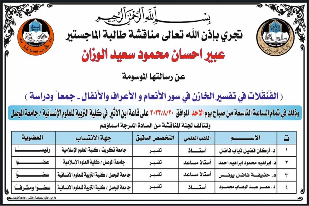 ناقشت كلية التربية للعلوم الإنسانية بجامعة الموصل رسالة ماجستير عن (أثر انموذج دورة التعلم المعدلة في تحصيل طلاب الصف الرابع العلمي لمادة القرآن الكريم والتربية الإسلامية)