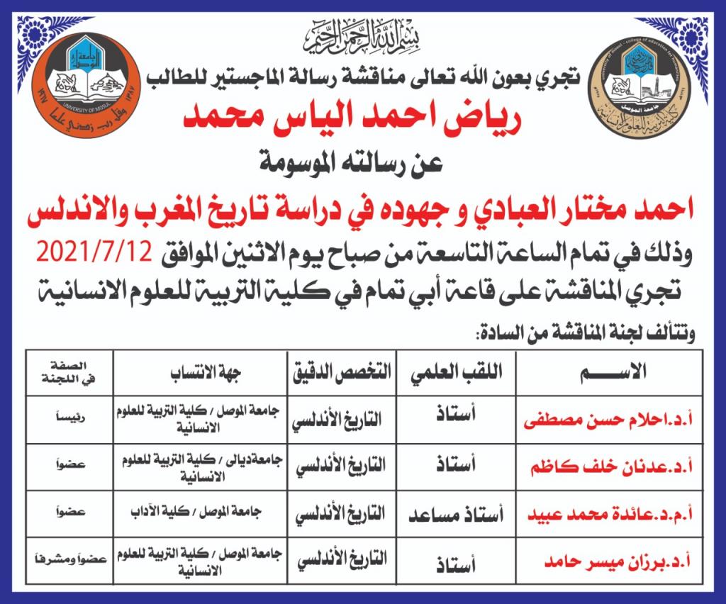 ناقش قسم التاريخ في كلية التربية للعلوم الانسانية بجامعة الموصل رسالة ماجستير عن( أحمد مختار العبادي وجهوده في دراسة تاريخ المغرب والاندلس )يوم الاثنين 2021/7/12، حضر جانباً منها الاستاذ الدكتور حازم ذنون اسماعيل السبعاوي عميد الكلية وعدد من تدريسيي الكلية.تناولت الرسالة التي تقدم بها الطالب ( رياض احمد الياس ) في قسم التاريخ،أحمد مختار العبادي وجهوده التي قدمها للمكتبة العربية والاسلامية في التحقيق والتأليف ونشر العديد من الابحاث.تطرقت الدراسة في الفصل الاول عن التعريف بشخصية العبادي اما الفصل الثاني عن منهج العبادي ومصادره في كتابة تاريخ المغرب والاندلس في حين تطرقت الدراسة في الفصل الثالث الى النتاج العلمي للعبادي.وتهدف الدراسة الى تسليط الضوء على نتاجات ومنهجية هذا المؤرخ، حيث كان لمجهوداته العلمية دور كبير في اثراء المكتبة العربية بالمؤلفات والابحاث ليس في تاريخ المغرب والاندلس وحسب بل تعداه الى تاريخ المشرق العربي.ترأس لجنة المناقشة.الاستاذ الدكتور أحلام حسن مصطفىوعضوية كل منالاستاذ الدكتور عدنان خلف كاظم والاستاذ المساعد الدكتورة عائدة محمد عبيدوبإشراف الاستاذ الدكتور برزان ميسر حــــــامــــــــــد