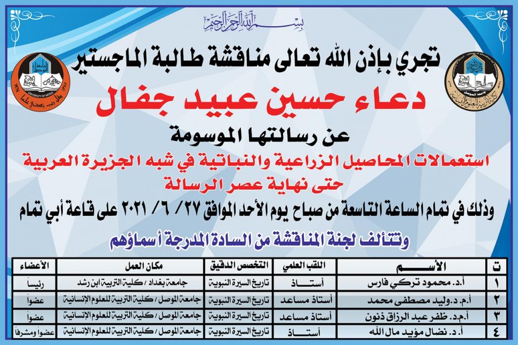 ناقش قسم التاريخ في كلية التربية للعلوم الإنسانية بجامعة الموصلرسالة ماجستير عن( استعمالات المحاصيل الزراعية والنباتية في شبه الجزيرة العربية حتى نهاية عصر الرسالة )في يوم 2021/6/27، حضر جانبا منها الأستاذ الدكتور حازم ذنون إسماعيل السبعاوي عميد الكلية وعدد من تدريسيي الكليةتناولت الرسالة التي تقدمت بها الطالبة ( دعاء حسين عبيد ) في قسم التاريخ.شهدت منطقة شبه الجزيرة العربية نشاط اقتصادي مزدهر، ولاسيما في استعمالات المحاصيل الزراعية والنباتية، وبهذا الصدد تنوعت مظاهرها والتي تنتج عنها نشاط صناعي وعلاقات تجارية داخلية وخارجية اذا تمثلت التجارة الداخلية بين مناطق شبه الجزيرة العربية، فيما كانت التجارة الخارجية تتم عن طريق القوافل التجارية مع المناطق المجاورة لشبه الجزيرة العربية كالهند والسند والعبث، وكانت المحاصيل الزراعية والنباتية قديما هي المقوم الأساسي للتجارة العالمية، وان هذا دفع الدول الاستعمارية في العالم الى التنافس والسيطرة على شبه الجزيرة العربية.تطرقت الدراسة الى جغرافية شبه الجزيرة العربية، وإنتاج المحاصيل الزراعية، وحرف وصناعات المحاصيل الزراعية والنباتية.تهدف الرسالةالى ابراز أهمية هذا الموضوع لخدمة المجتمع والحاجة الماسة الى هذه المحاصيل الزراعية والنباتية في حياة المجتمع في عصر الرسالةترأس لجنة المناقشةالأستاذ الدكتور : محمود تركي فارسالأستاذ المساعد الدكتور: وليد مصطفى محمدوالاستاذ المساعد الدكتور : ظفر عبد الرزاق ذنونوباشراف وعضوية الأستاذ الدكتور: نضال مؤيد ماالله.